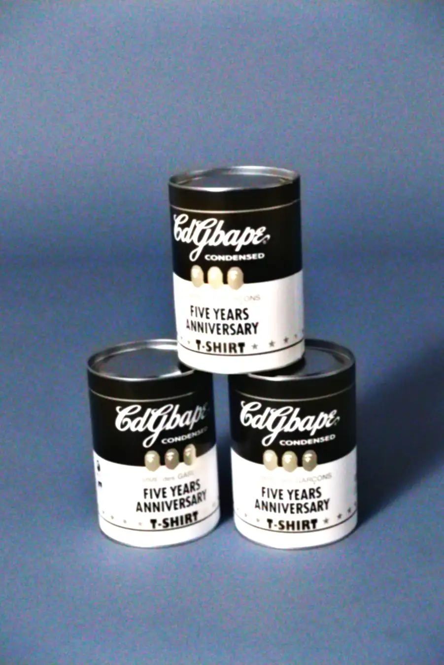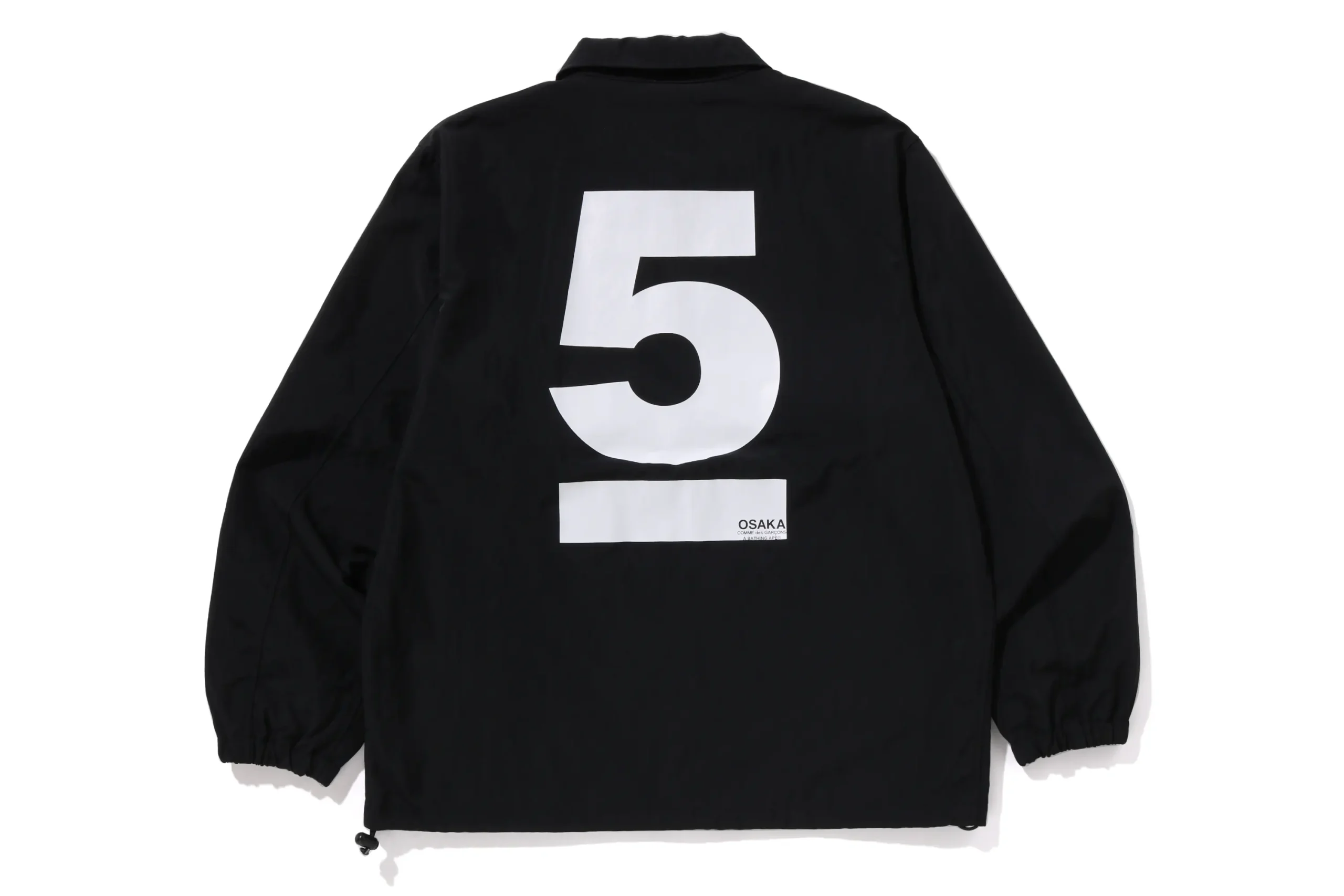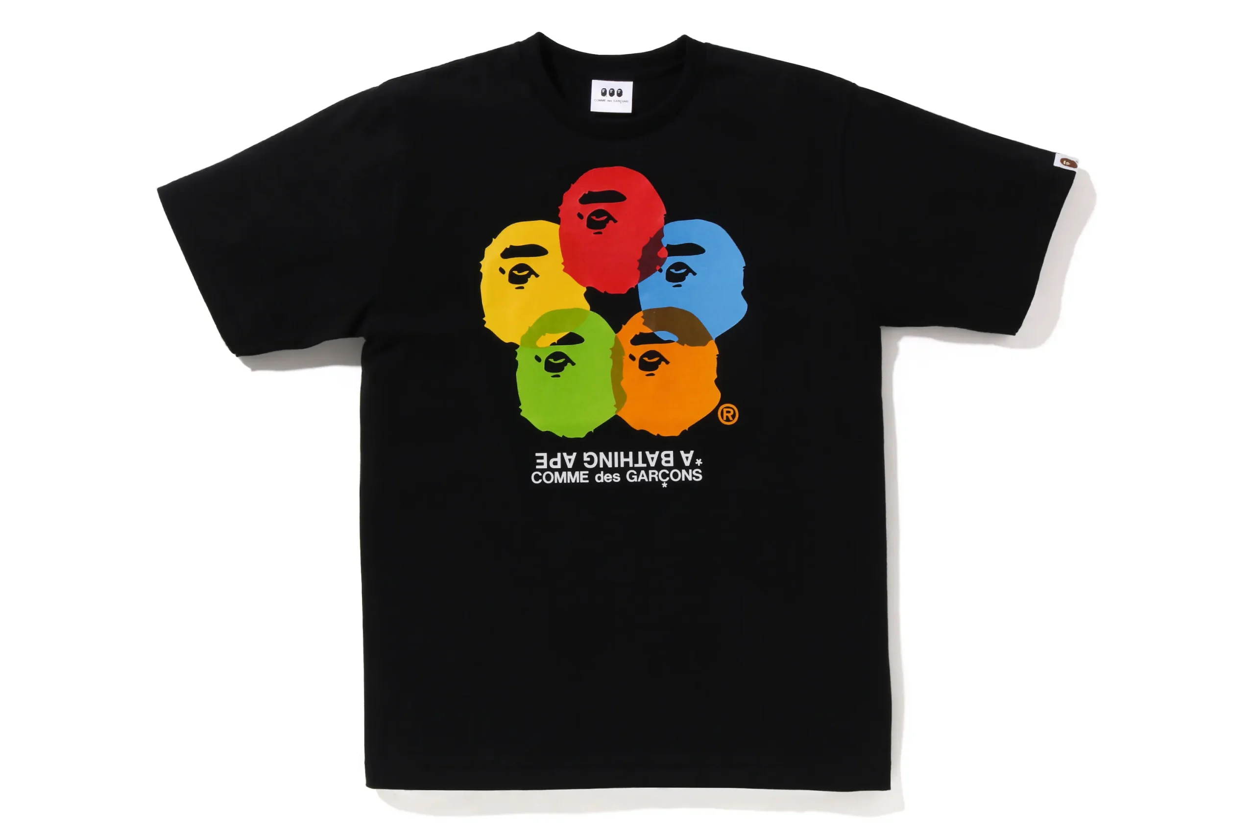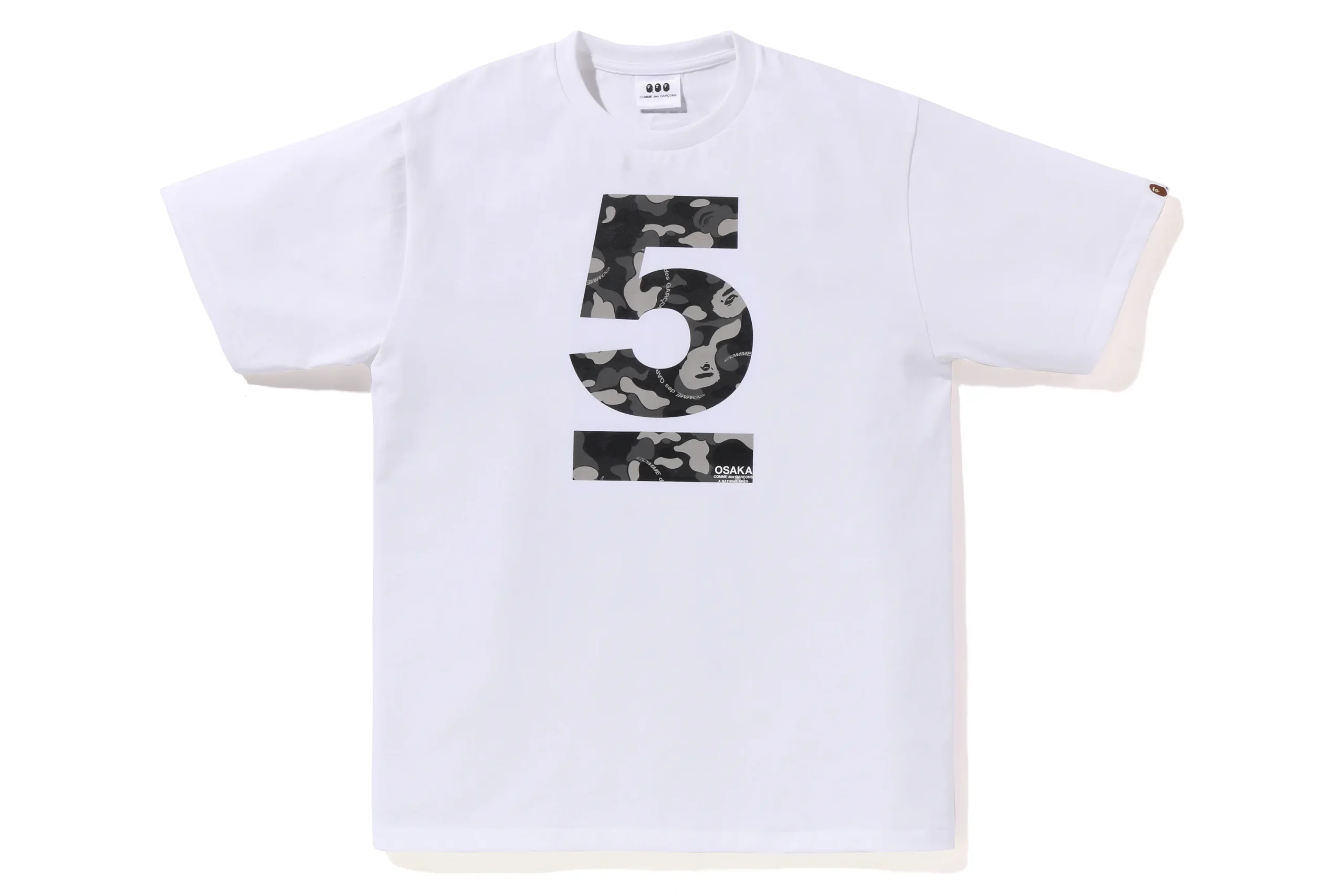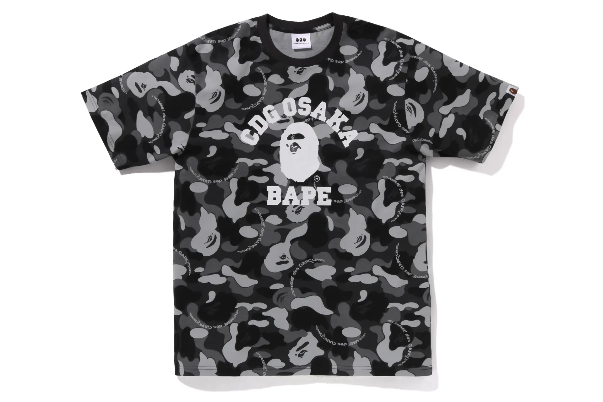 モノトーンのオリジナルカモフラージュを全面にあしらい、CDG OSAKA BAPE® のカレッジロゴをプリントしたグラフィックTシャツをはじめ、5周年にちなんで5色の“APE HEAD”が重なり合ったデザインや、CAMO柄の5周年ロゴをフロントに大胆に配したモデルなど、いずれも周年を彩るスペシャル仕様となっている。