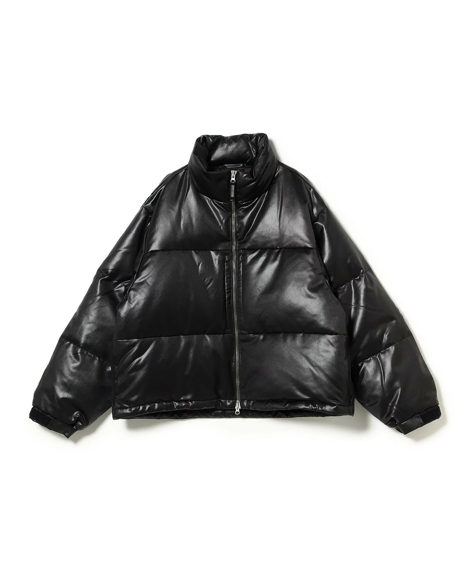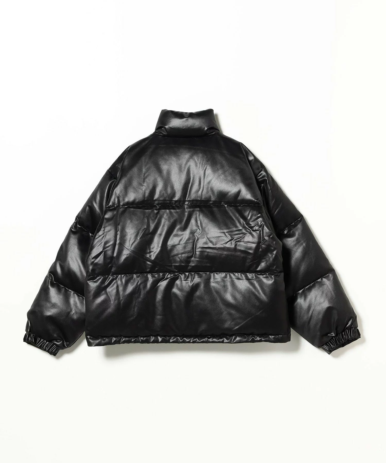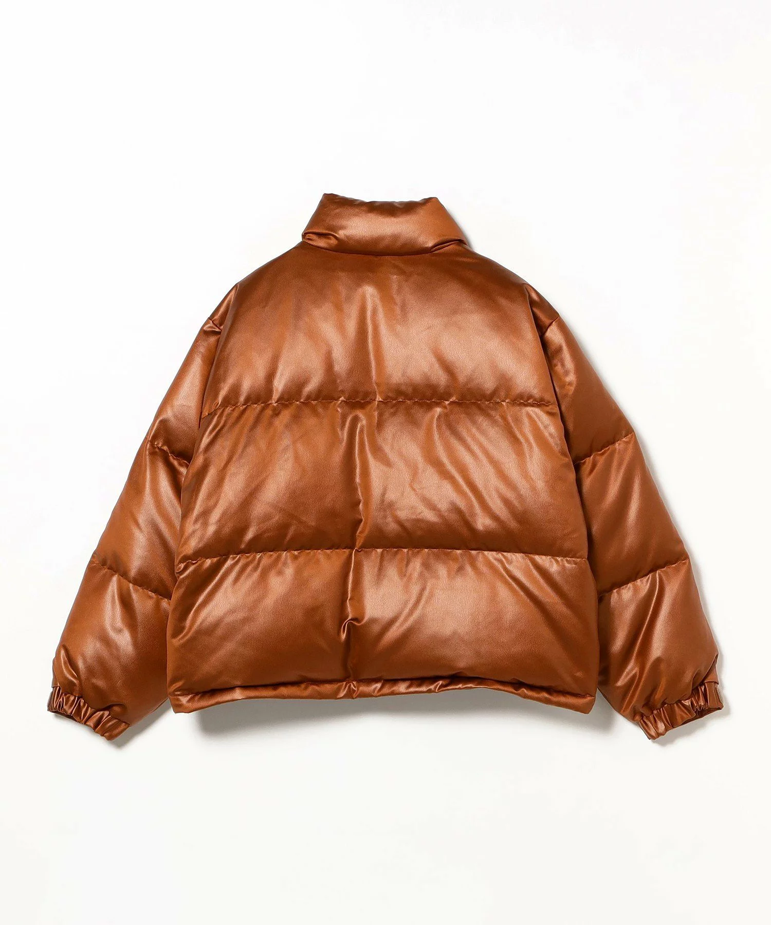 レザーライクな化繊素材を使用したショート丈のダウンブルゾン。