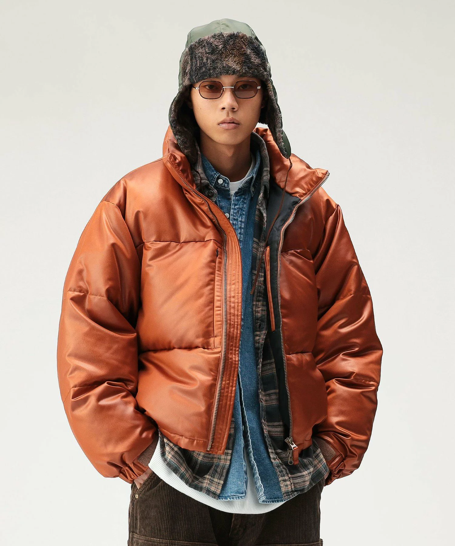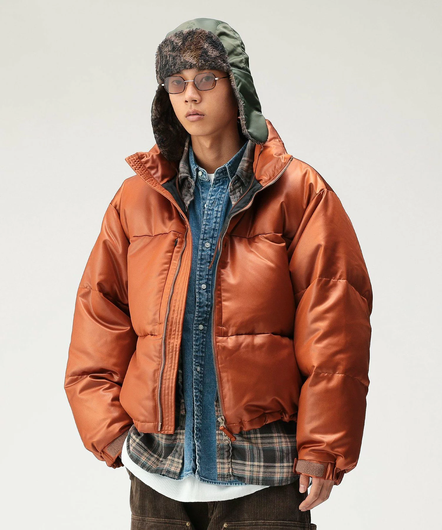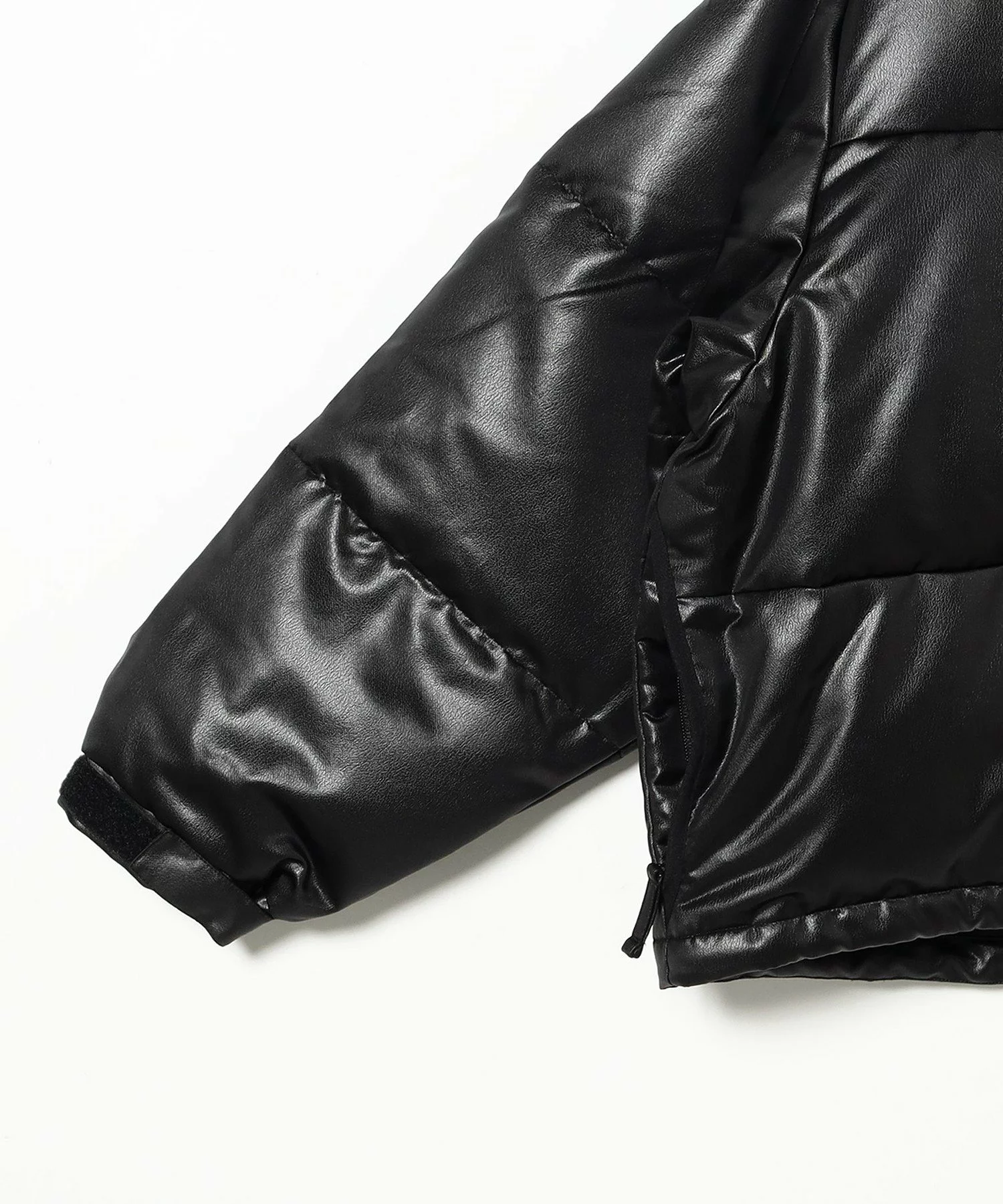 レザーライクな化繊素材を使用したショート丈のダウンブルゾン。