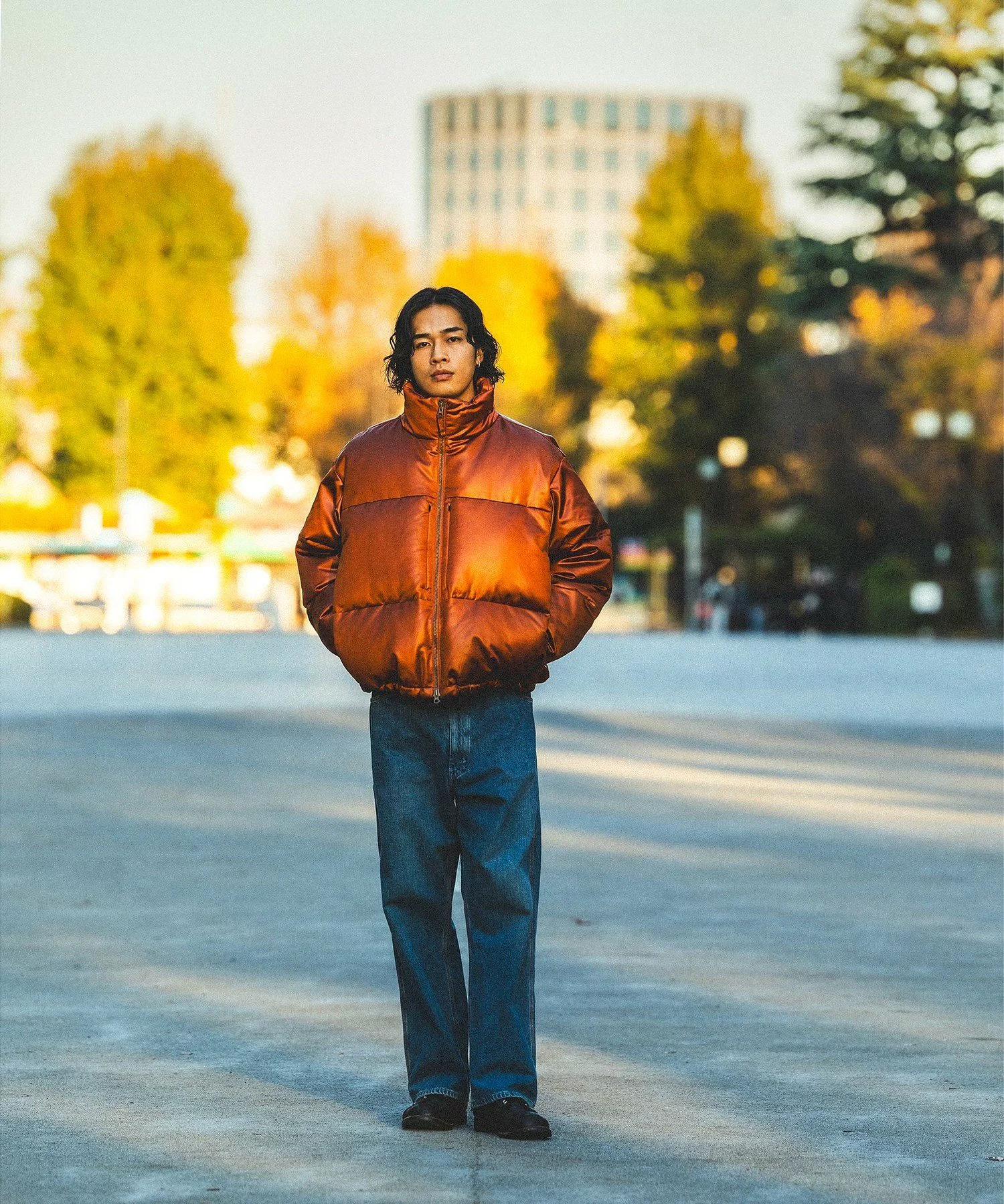 ワイドな身幅に対し、極端に着丈を短く設定したワイドショートフィット。