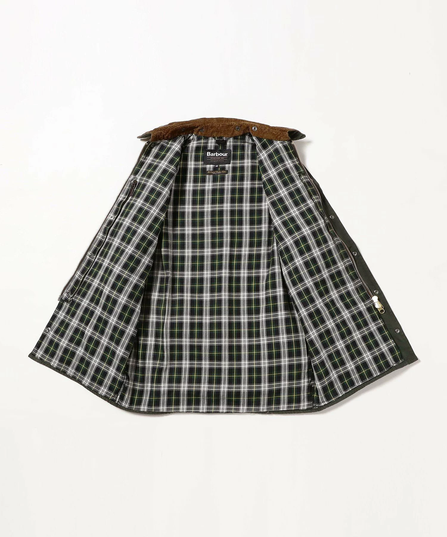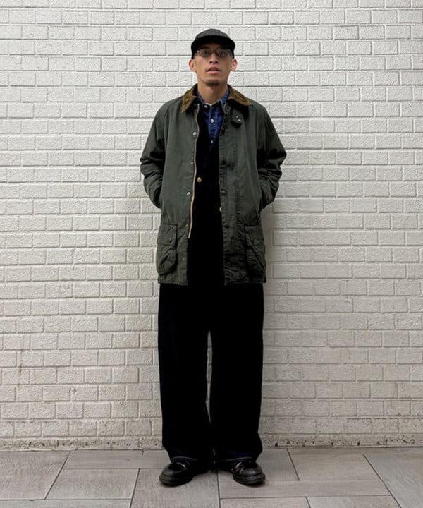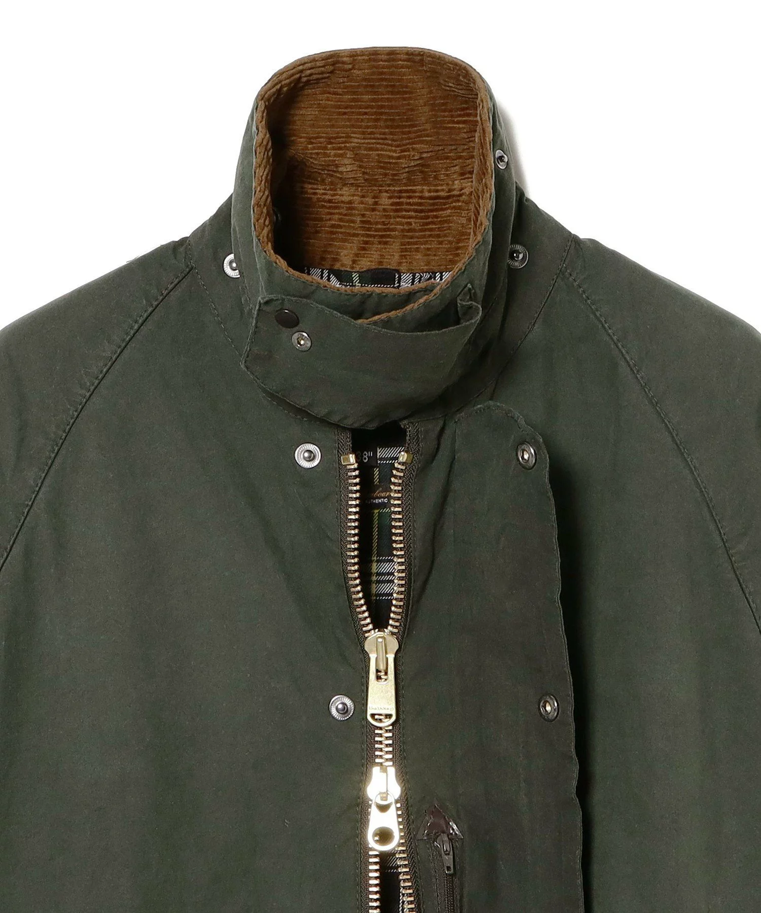 また、登場当初のディテールを再現し、フロントジップは Barbour ロゴ入りの棒ジップに、コーデュロイの襟は金茶に変更。