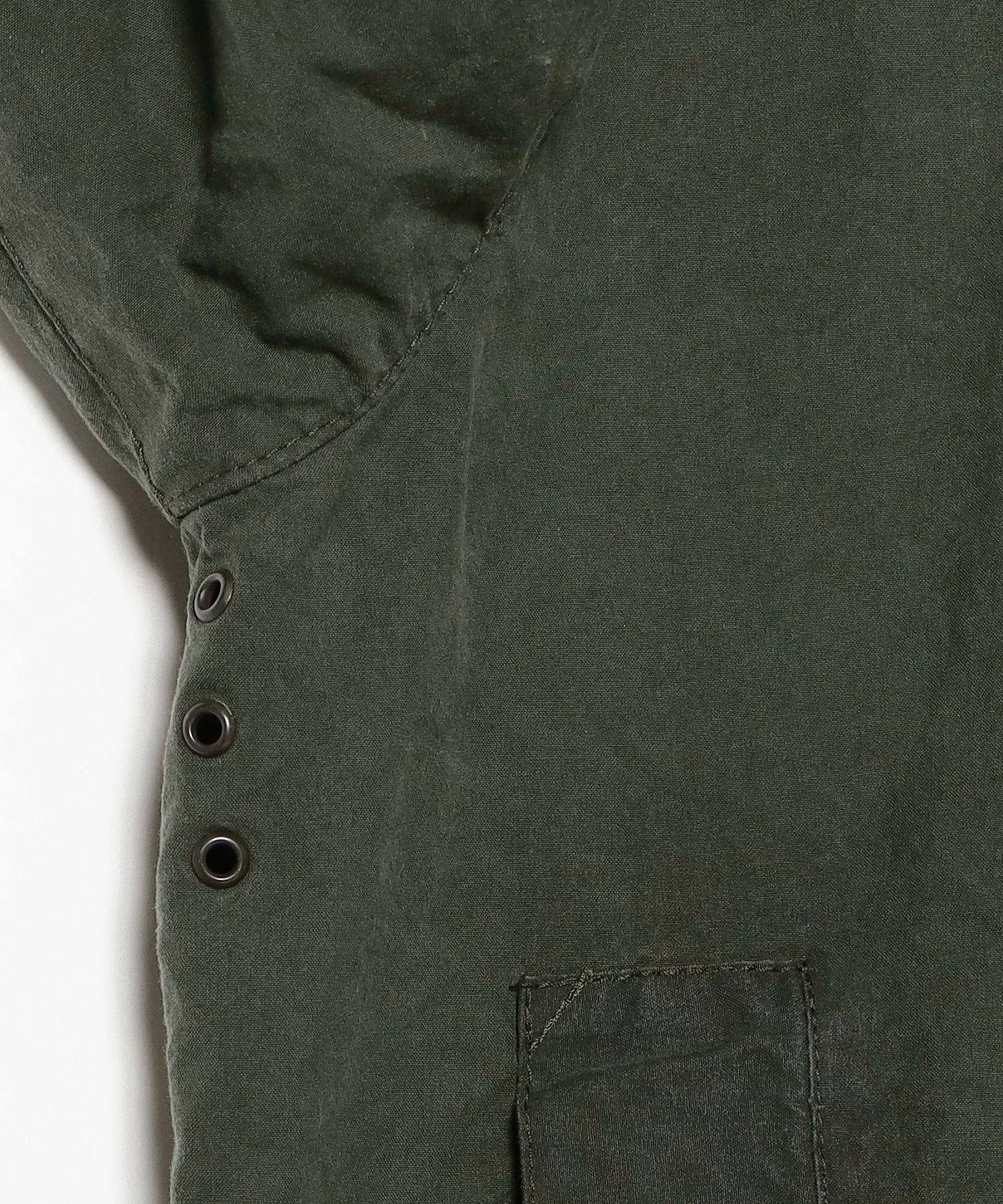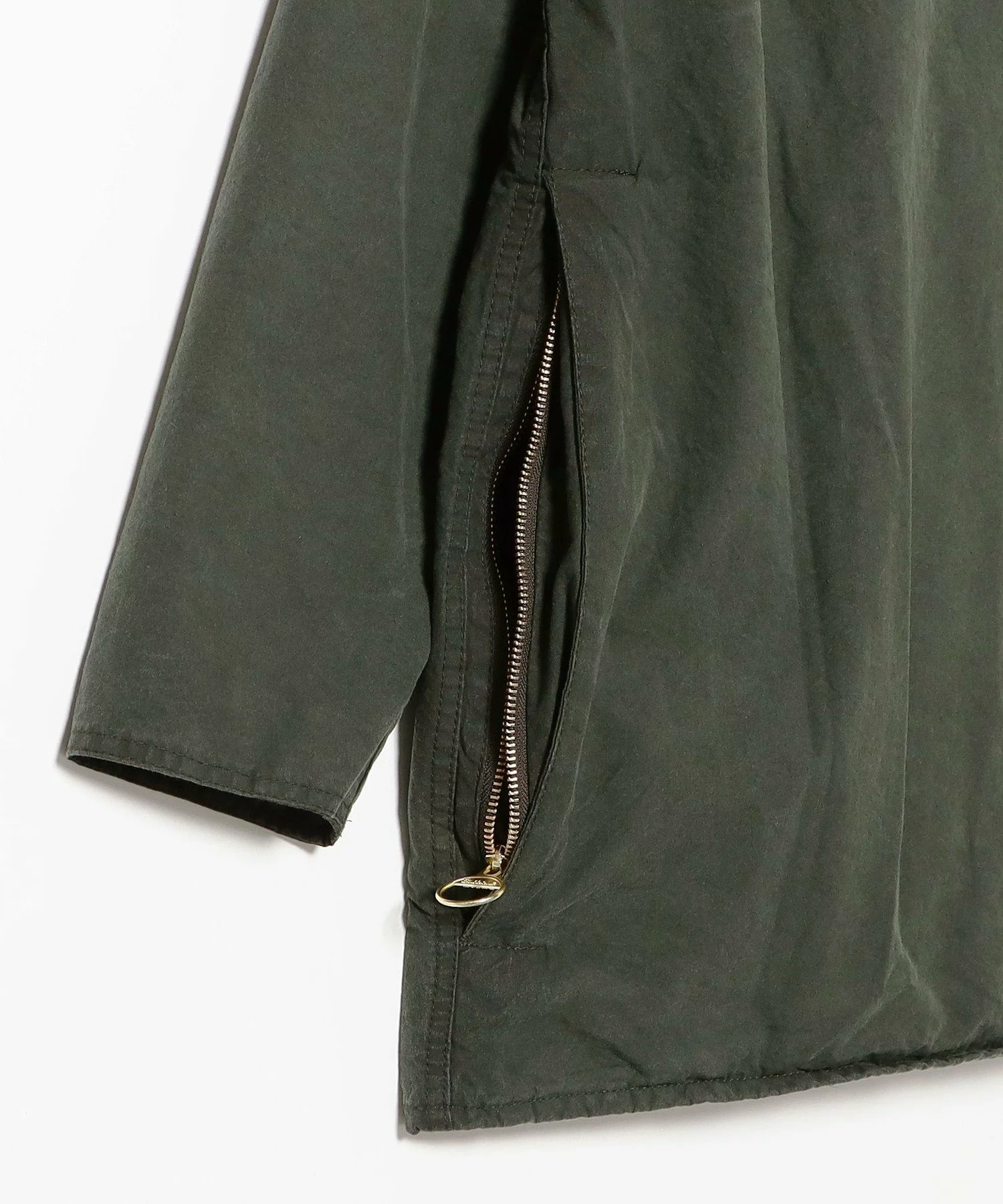 オイルドコットンに洗いを施すことで、長年着続けたかのような趣深い表情が生まれ、オイルは約60~70%カットされ、より軽やかな風合いに仕上げられている。