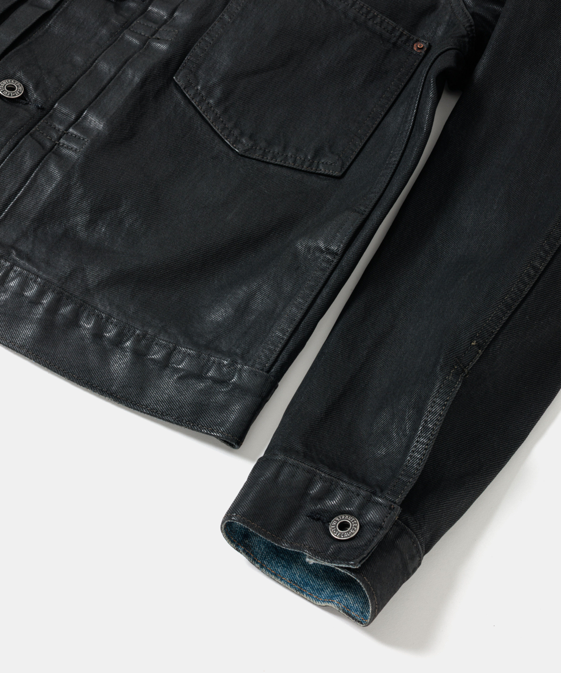 デニムのベースカラーにはウォッシュをかけたヴィンテージ風のライトインディゴカラーにし、その上にブラックのPUコーティングを施すことで、伝統的かつ前衛的でコンテンポラリーな風合いを表現。