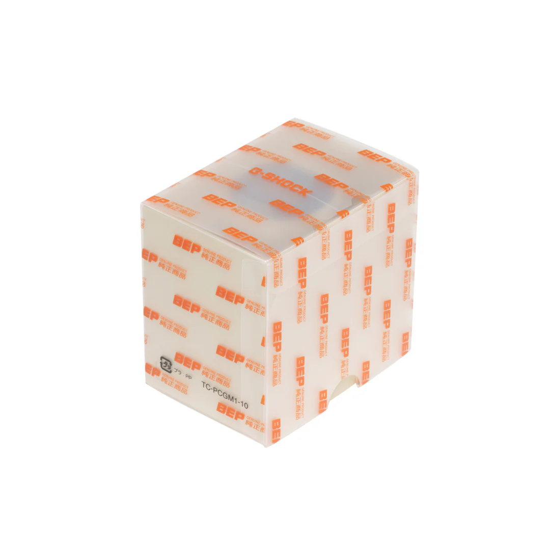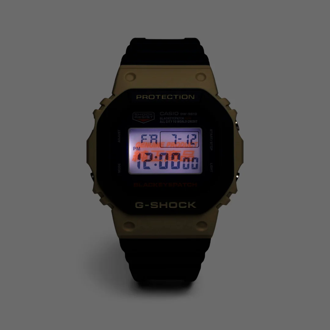 G-SHOCK の DW-5610 を採用した本作は、インダストリアルなデザインを意識し、ネイビーとベージュをベースにワークウェアで用いられることの多いオレンジの差し色を入れ、バックライトとバック刻印には”純正商品”表記をデザイン。