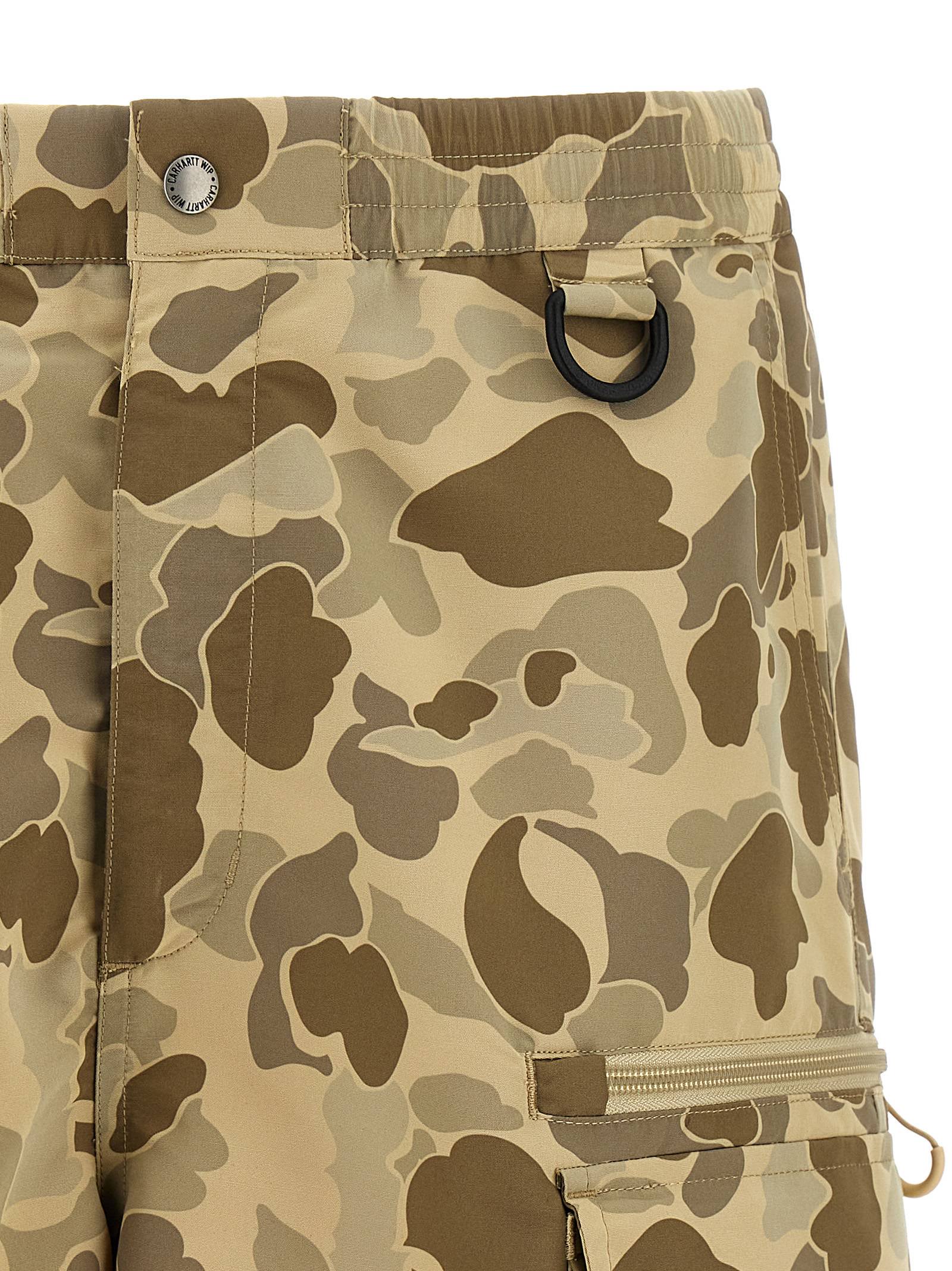 機能的な特徴として、ドローストリング付きの伸縮性のあるウエストバンド、フロントメタルDリングなどが搭載され、カーハートWIPのスクエアラベルがデザインを引き締めている。
