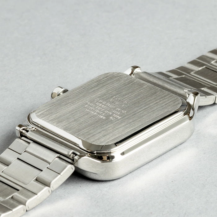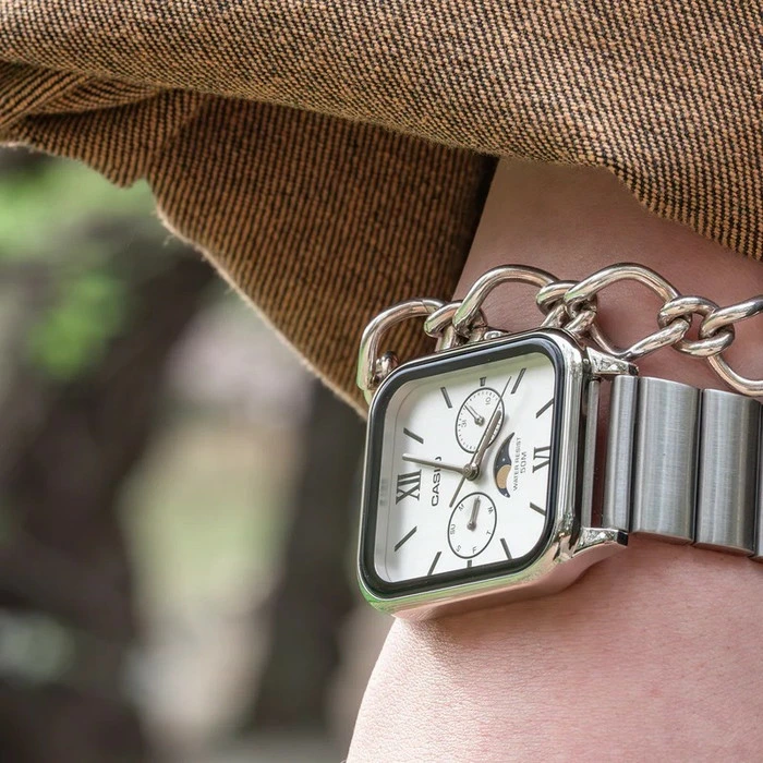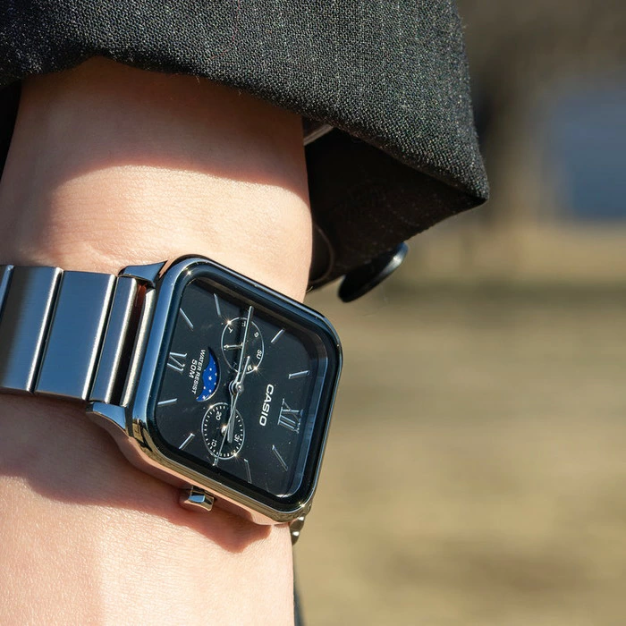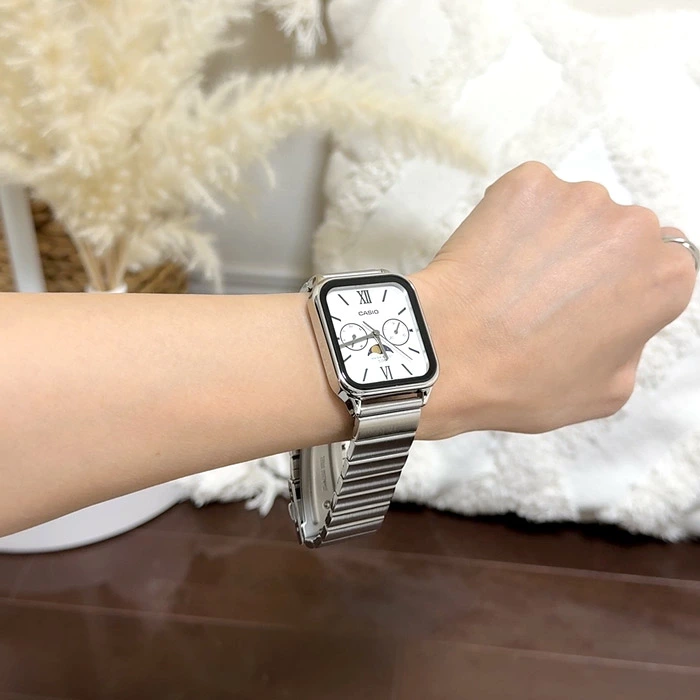 長方形のスタイリッシュなケースは、スマートウォッチを彷彿とさせるモダンなデザインで、都会的な印象を演出。