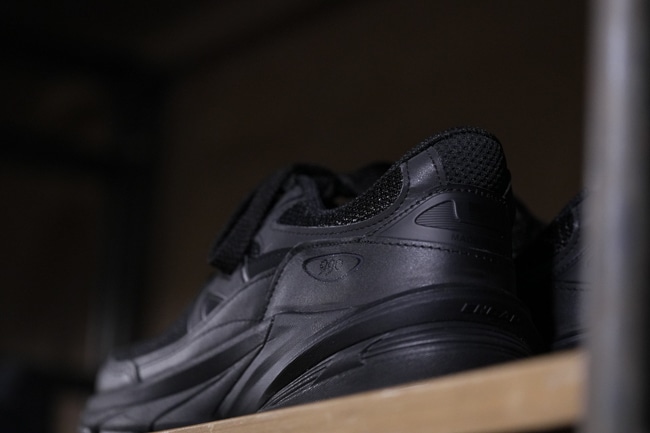 その最新モデルである 990v6のデザインは、今まで足の甲の部分に横断する形で搭載されていたミッドフットサドルが不要になり、ピッグスエードとシンセティックレザーのオーバーレイが、メッシュアッパーの上をかかとからつま先まで流れるように配されているのが特徴。
