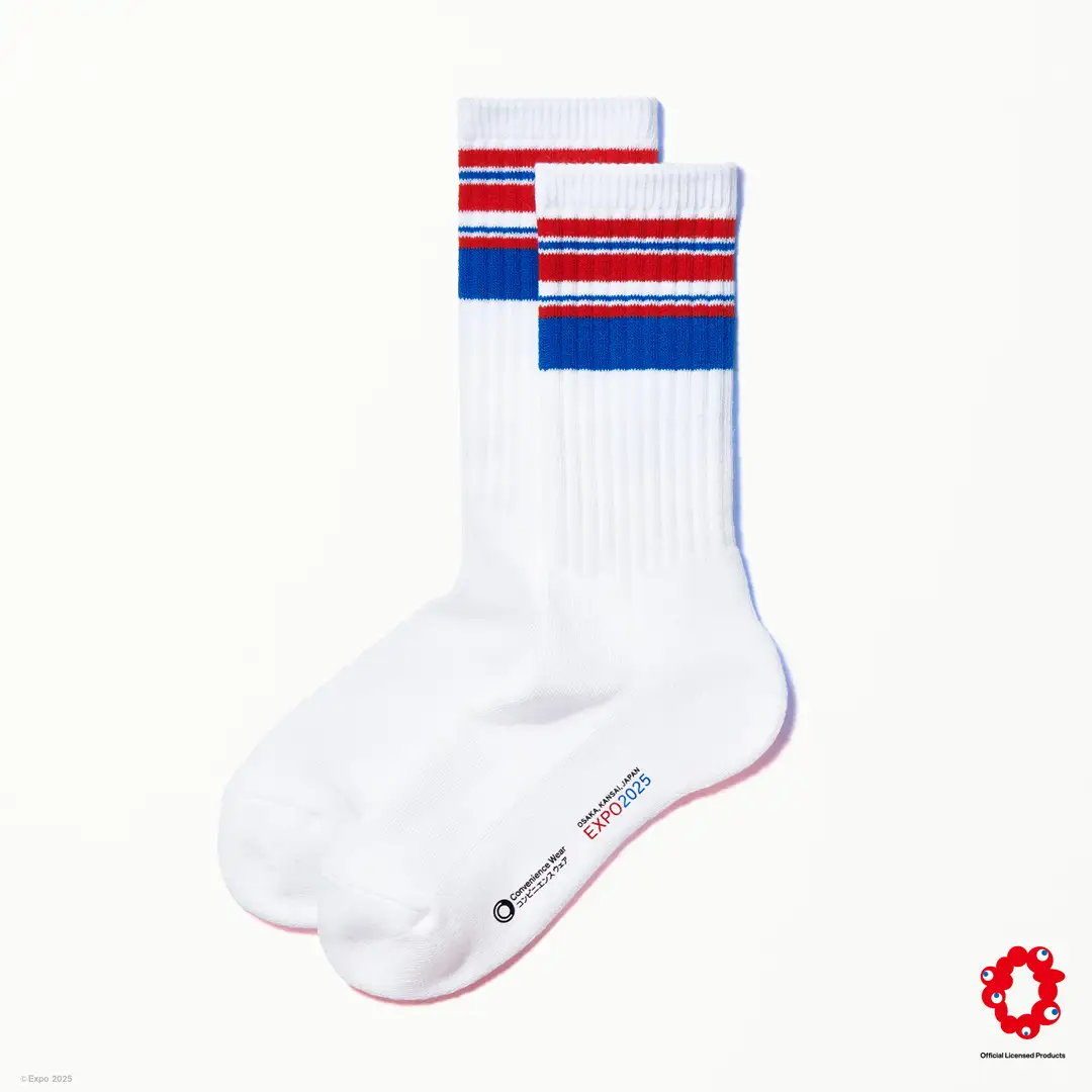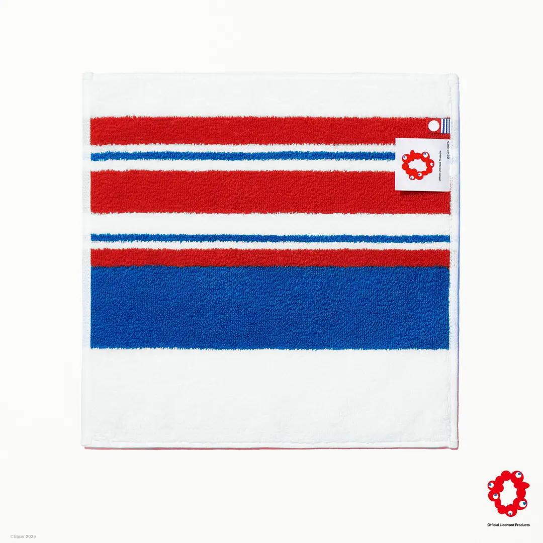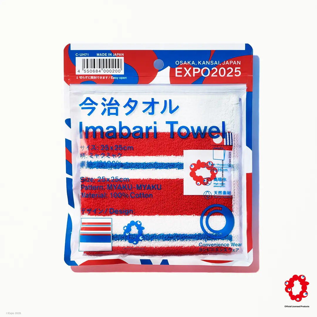 2025年大阪・関西万博の公式キャラクター「ミャクミャク」をイメージした今治タオルハンカチ、ラインソックスの計2型がラインナップ。