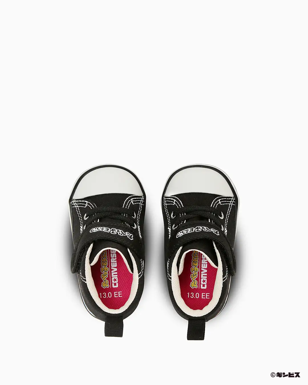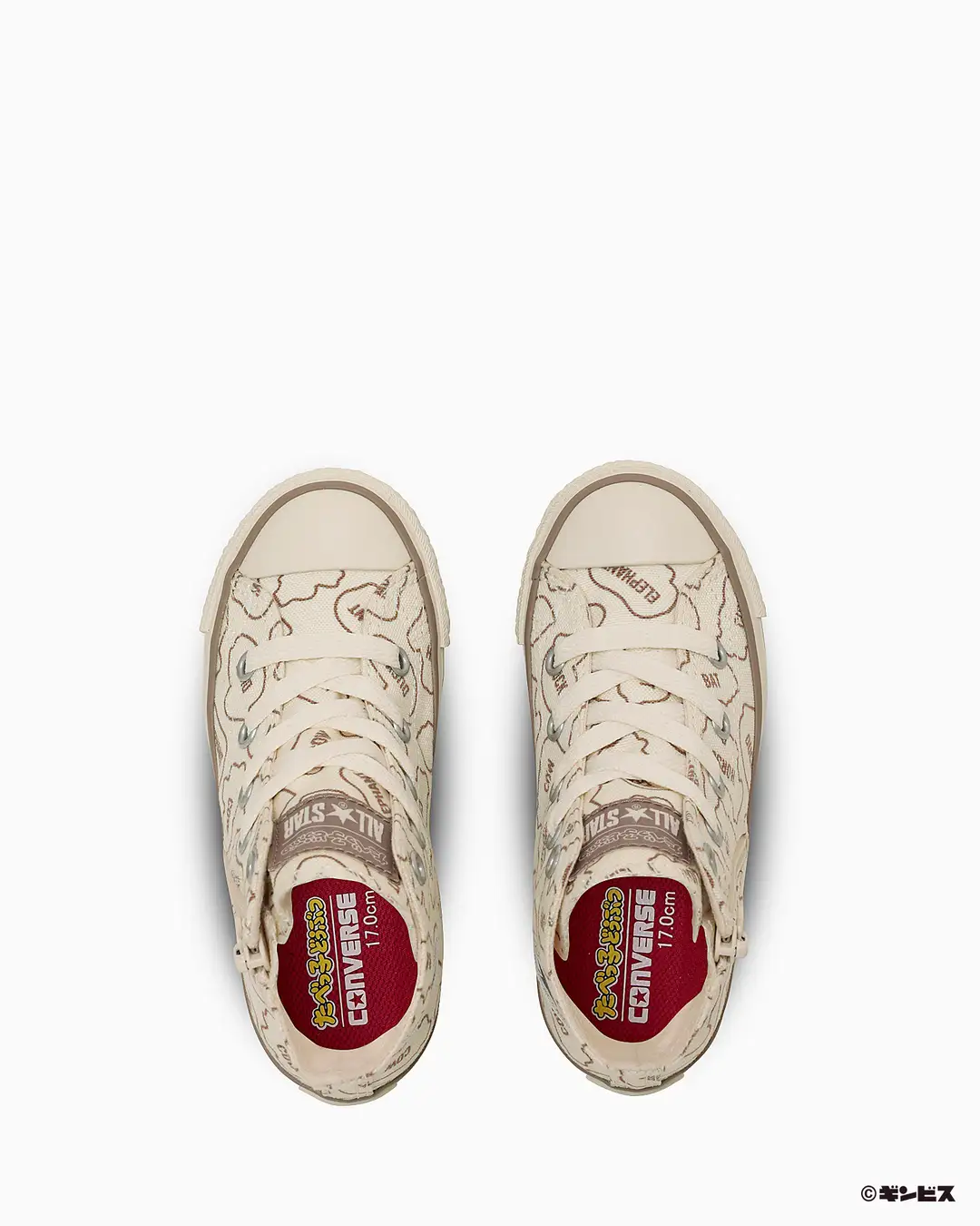 たべっ子どうぶつのパッケージでおなじみのどうぶつさん(ぞうさん、らいおんくん、うさぎさん、ねこさん)をプリントしたALL STAR HI、ビスケットのイメージをディテールで表現したALL STAR BS SLIP OX、どうぶつさんイラストを外腰にプリントしベルトにはたべっ子どうぶつのロゴをデザインしたキッズモデルのCHILD ALL STAR V-1 HIなどがラインナップする。