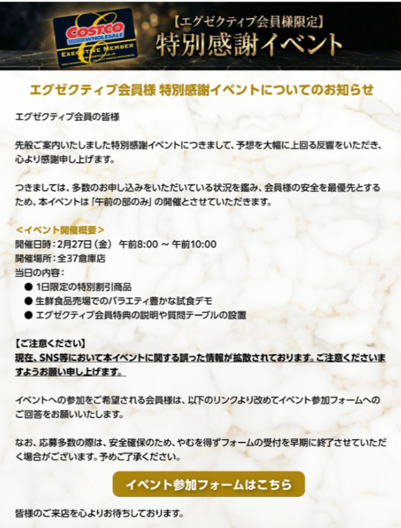 ・2026.02.10 UPDATE:Costco のエグゼクティブ会員限定特別感謝イベントにて販売が期待されていたが、公式から「現在、SNS等において本イベントに関する誤った情報が拡散されております。ご注意くださいますようお願い申し上げます。」との追加アナウンス有。
