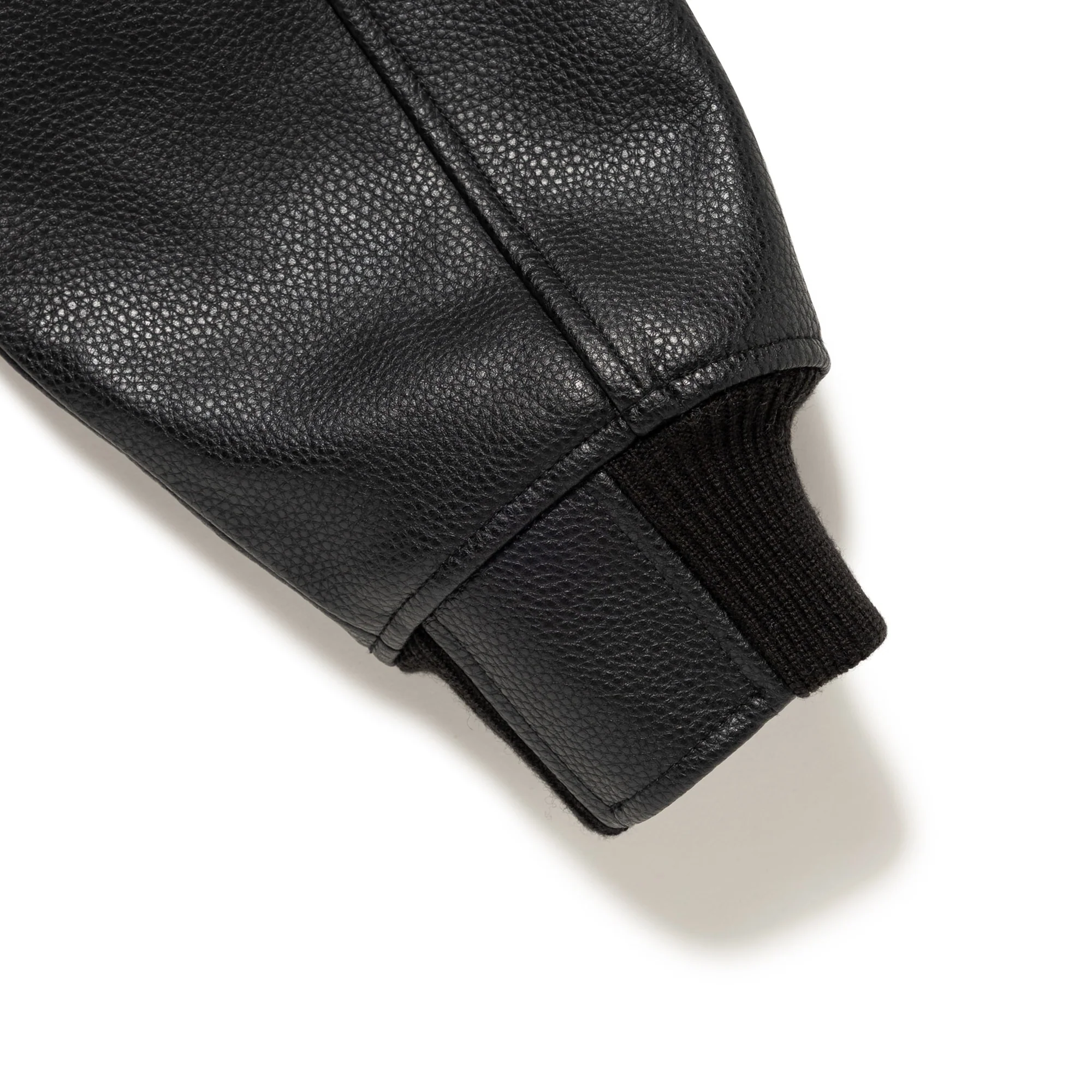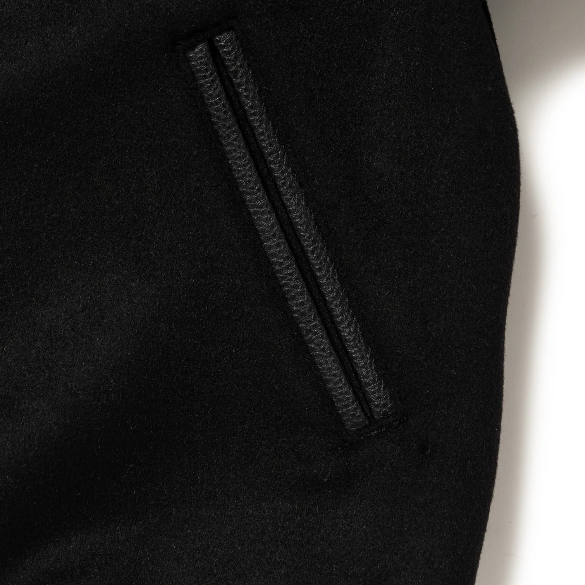 ウールメルトンをベースに、両袖を環境に優しいリサイクルレザーで切り替えたバーシティジャケット。