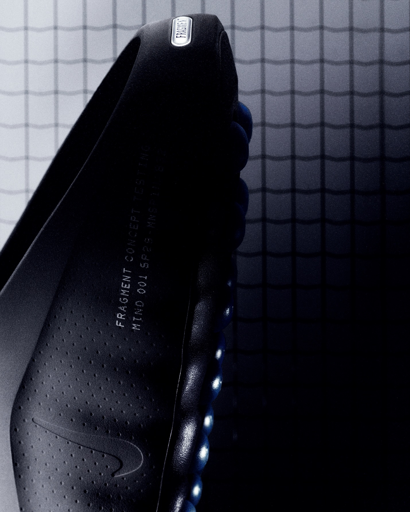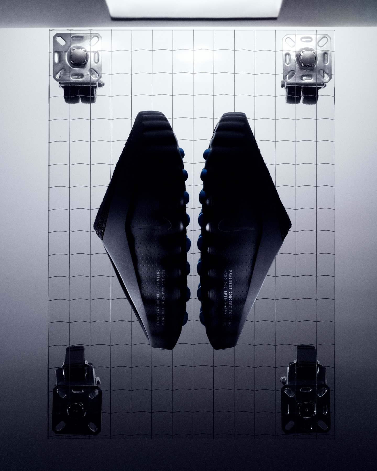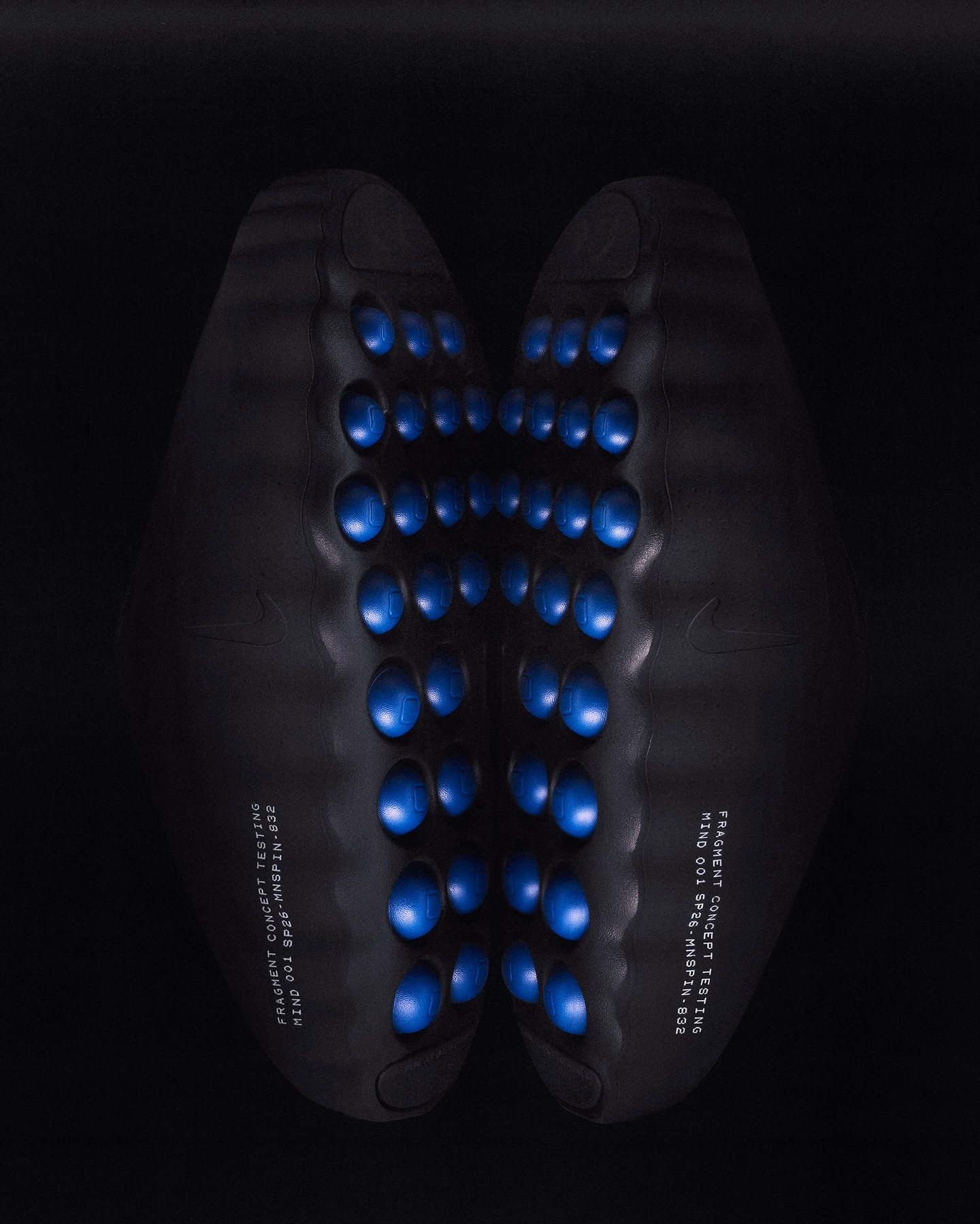 トゥやインソールにはアイコニックなサンダーボルトロゴを刻印し、サイドには“FRAGMENT CONCEPT TESTING MIND 001 SP26 – MNSPIN – 832”のデザインコードが落とし込まれている。