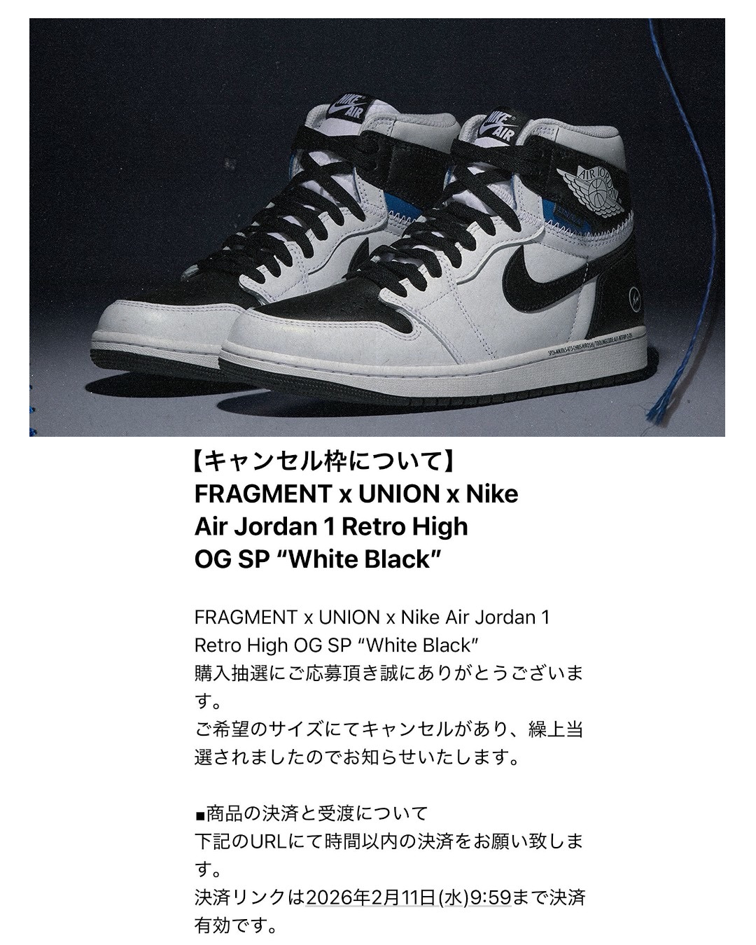 ・2026.02.15 UPDATE:fragment design × UNION × NIKE AIR JORDAN 1 の抽選結果メール配信が開始。