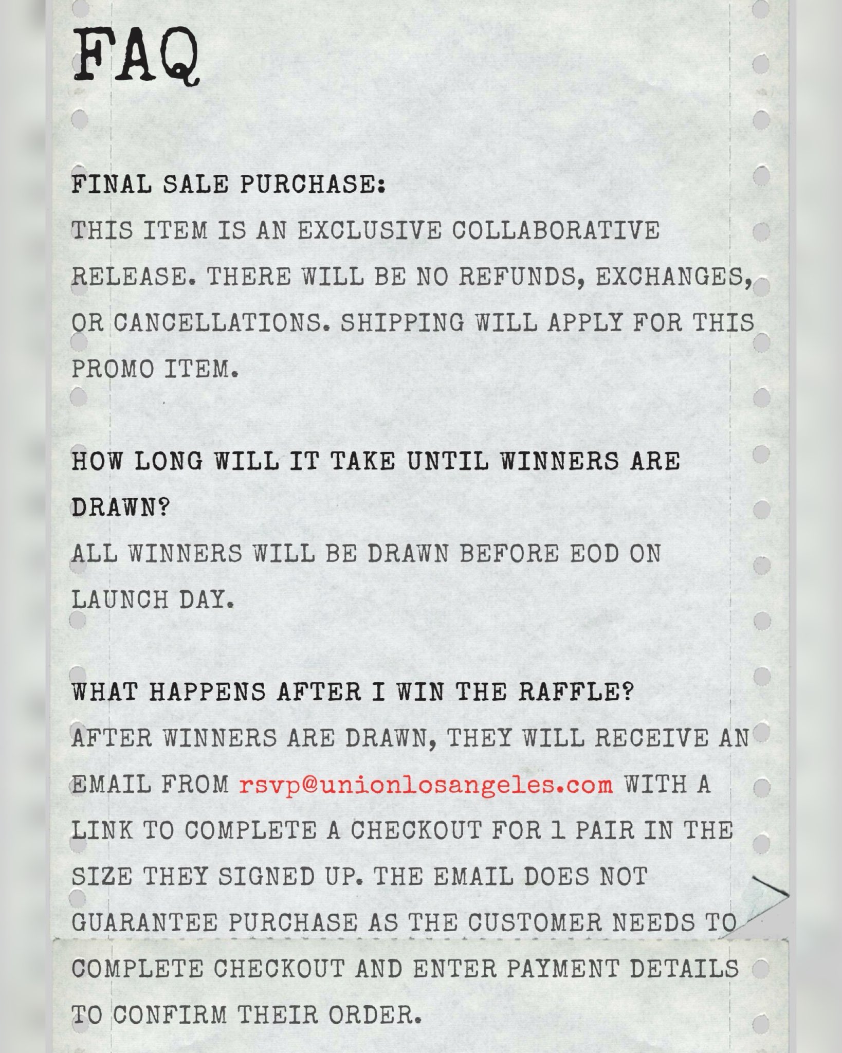 当選者には、rsvp@unionlosangeles.com から、登録したサイズの1足のチェックアウトを完了するためのリンクが記載されたメールが届きます。