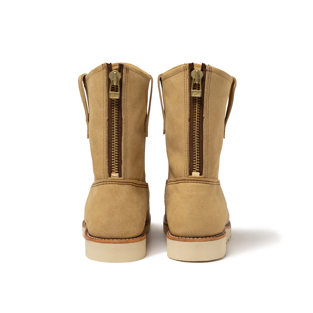 ブーツには、RED WING オリジナルのラフアウトレザー「ホーソーン・アビレーン」を使用し、履き口にあるプル・ストラップや側面に両者のブランドロゴをエンボス加工で表現。