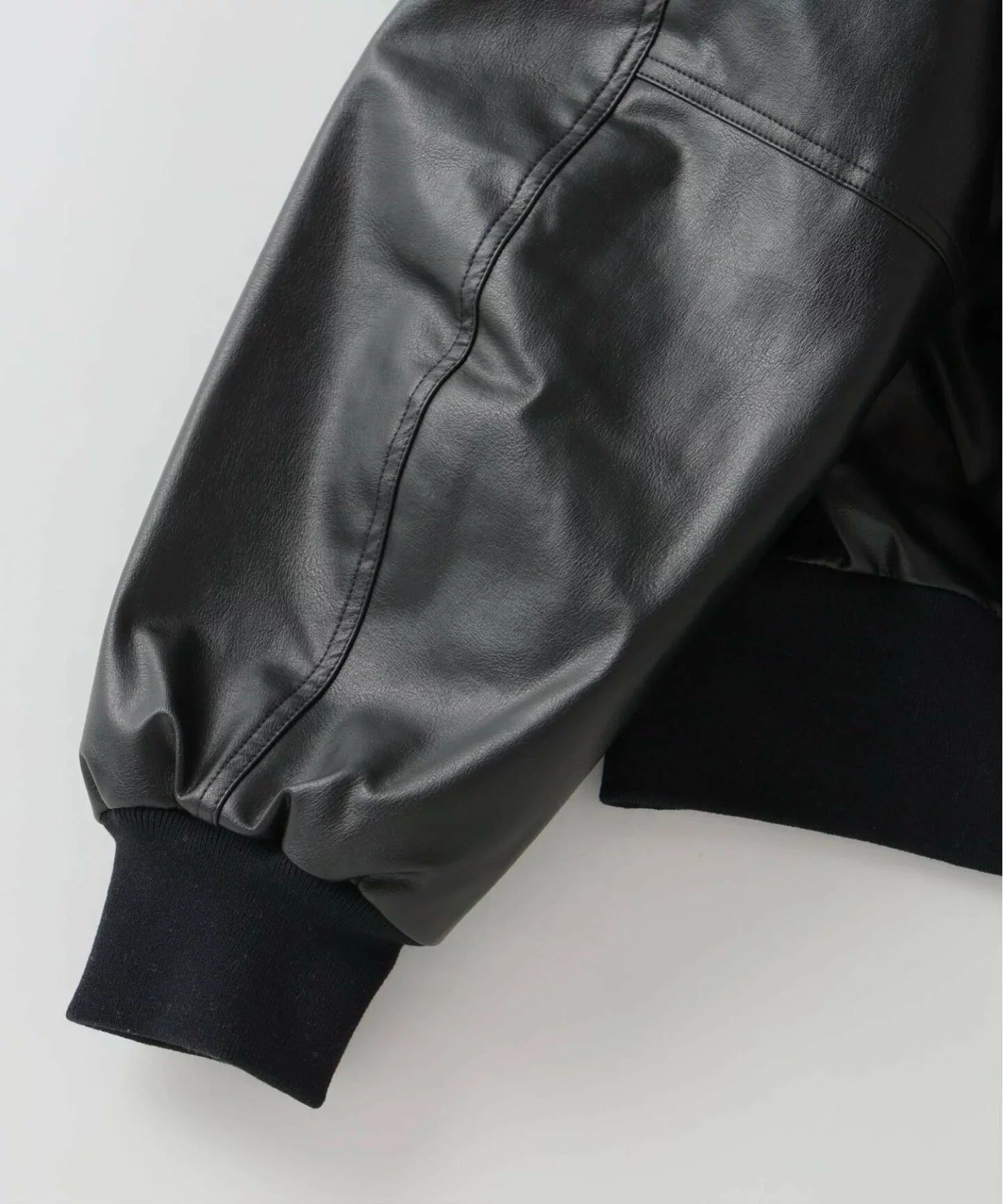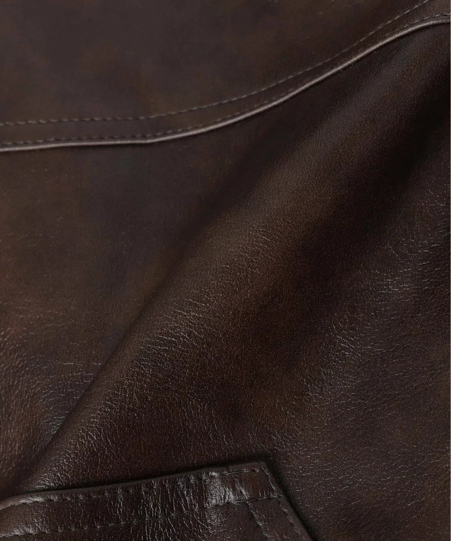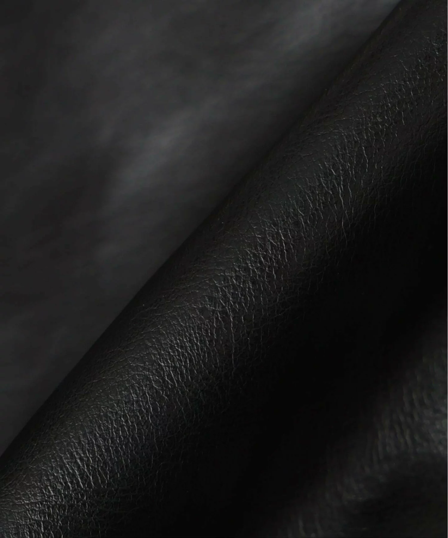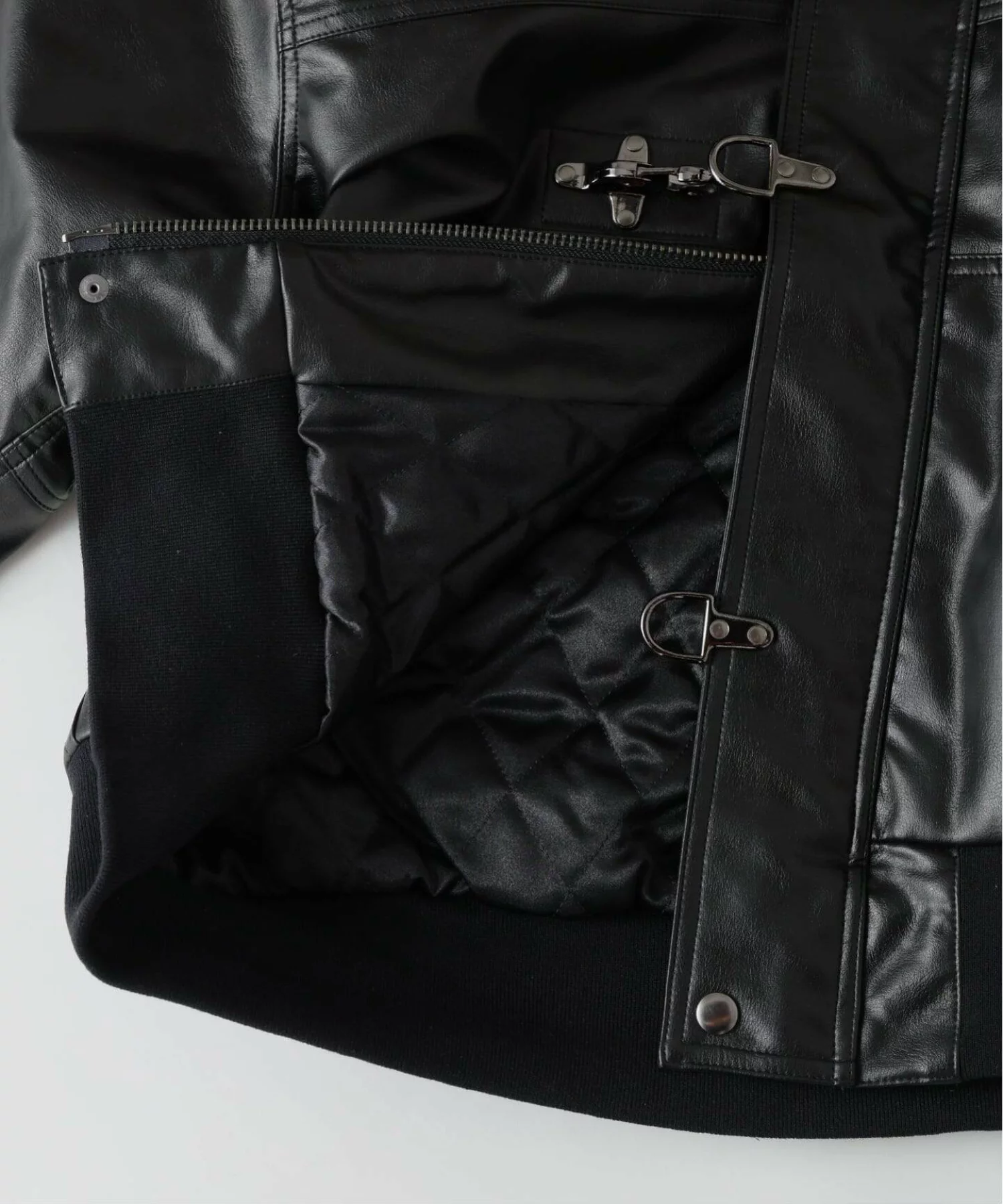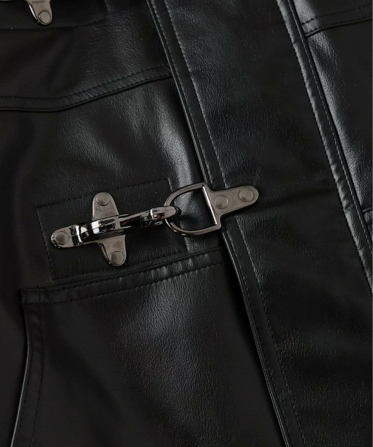 鈍い艶のフェイクレザーと金具のコントラストが際立つ無骨でリアルな1着