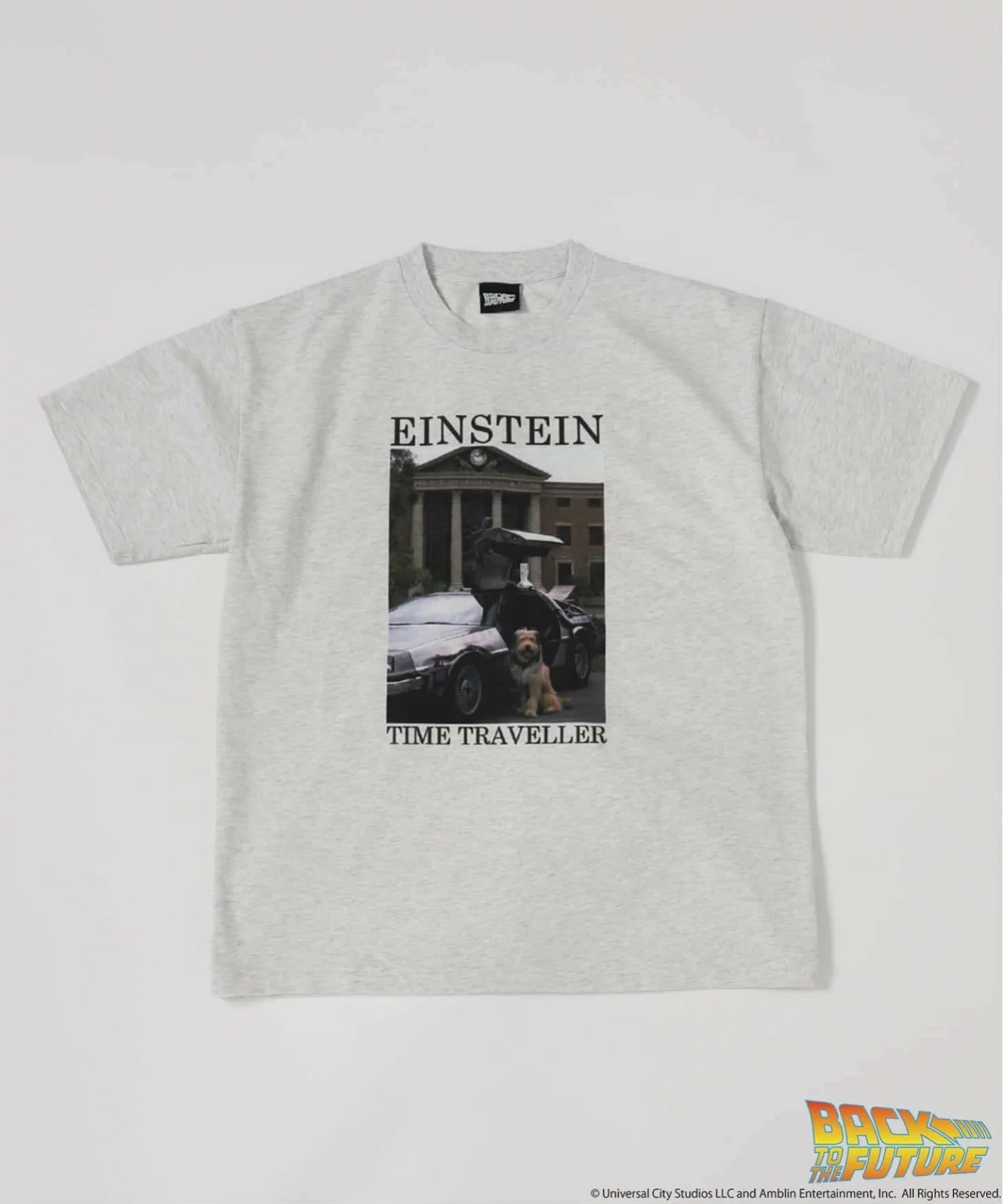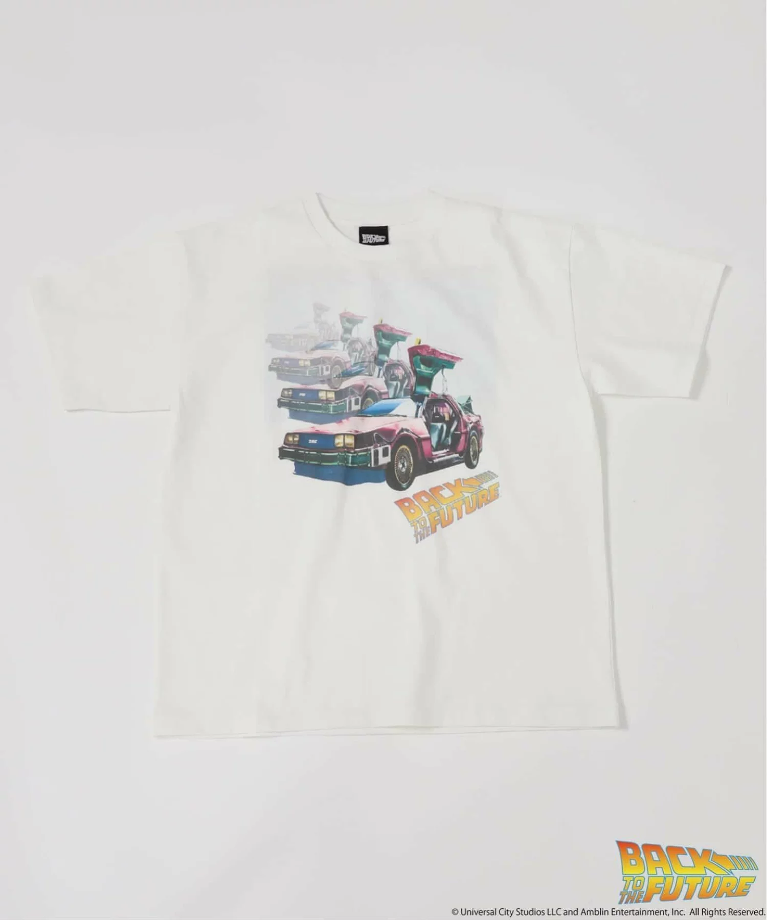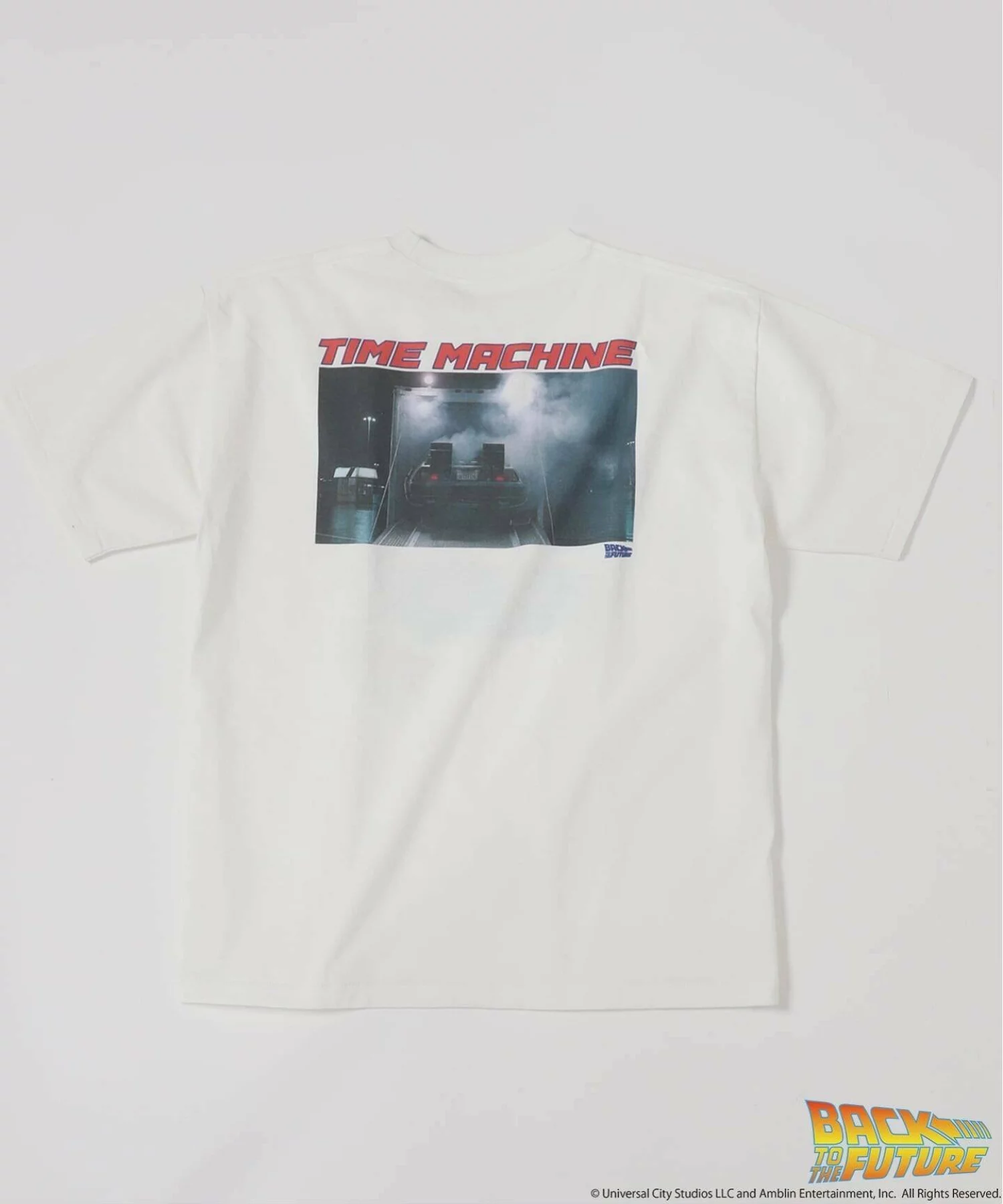 ・ホワイト(デロリアン):フロントには残像のように幾重にも重なるデロリアンのアートワークを配置。バックには「TIMEMACHINE」のレターとともに、トレーラーから姿を現す名シーンをプリント。