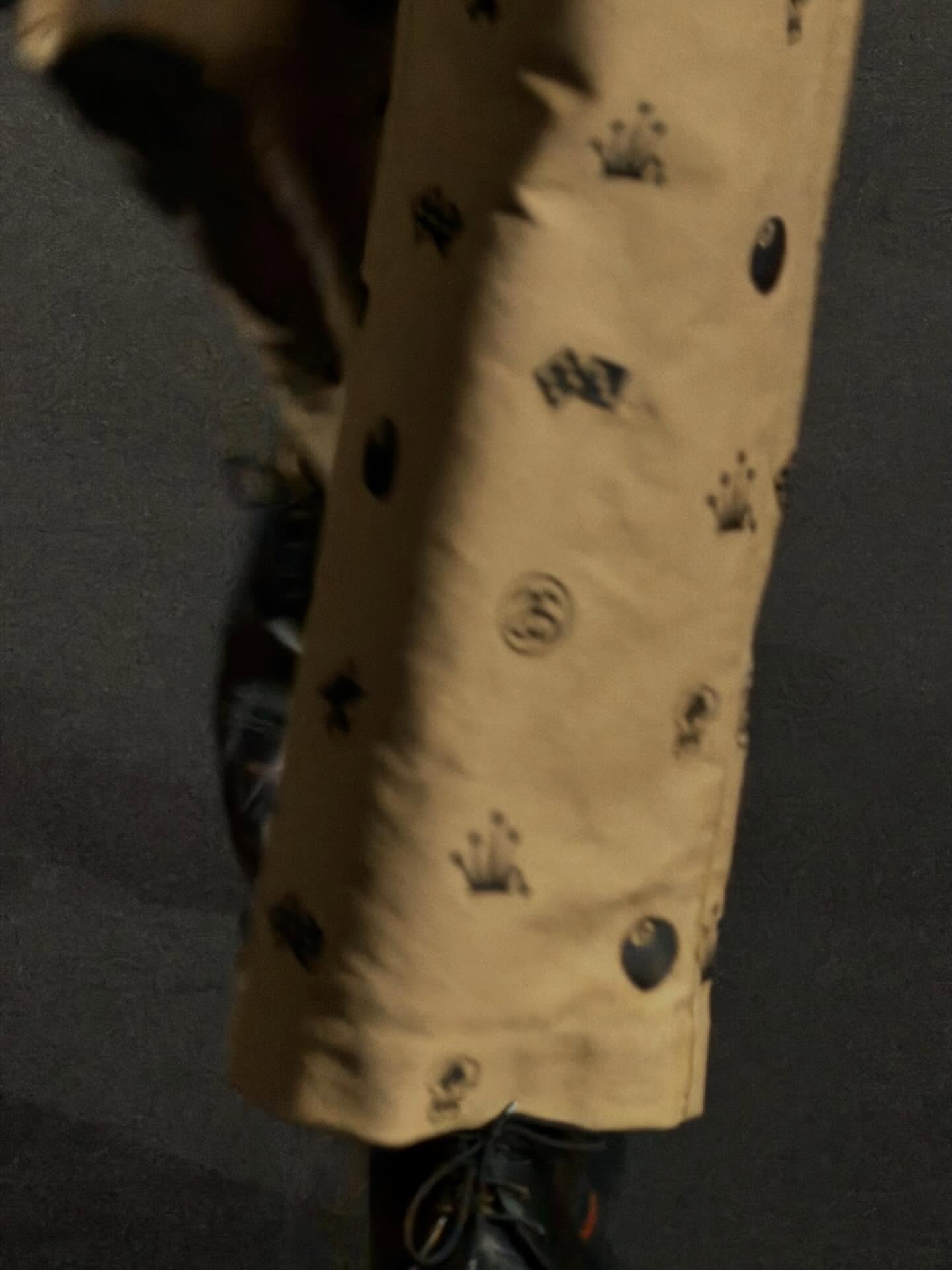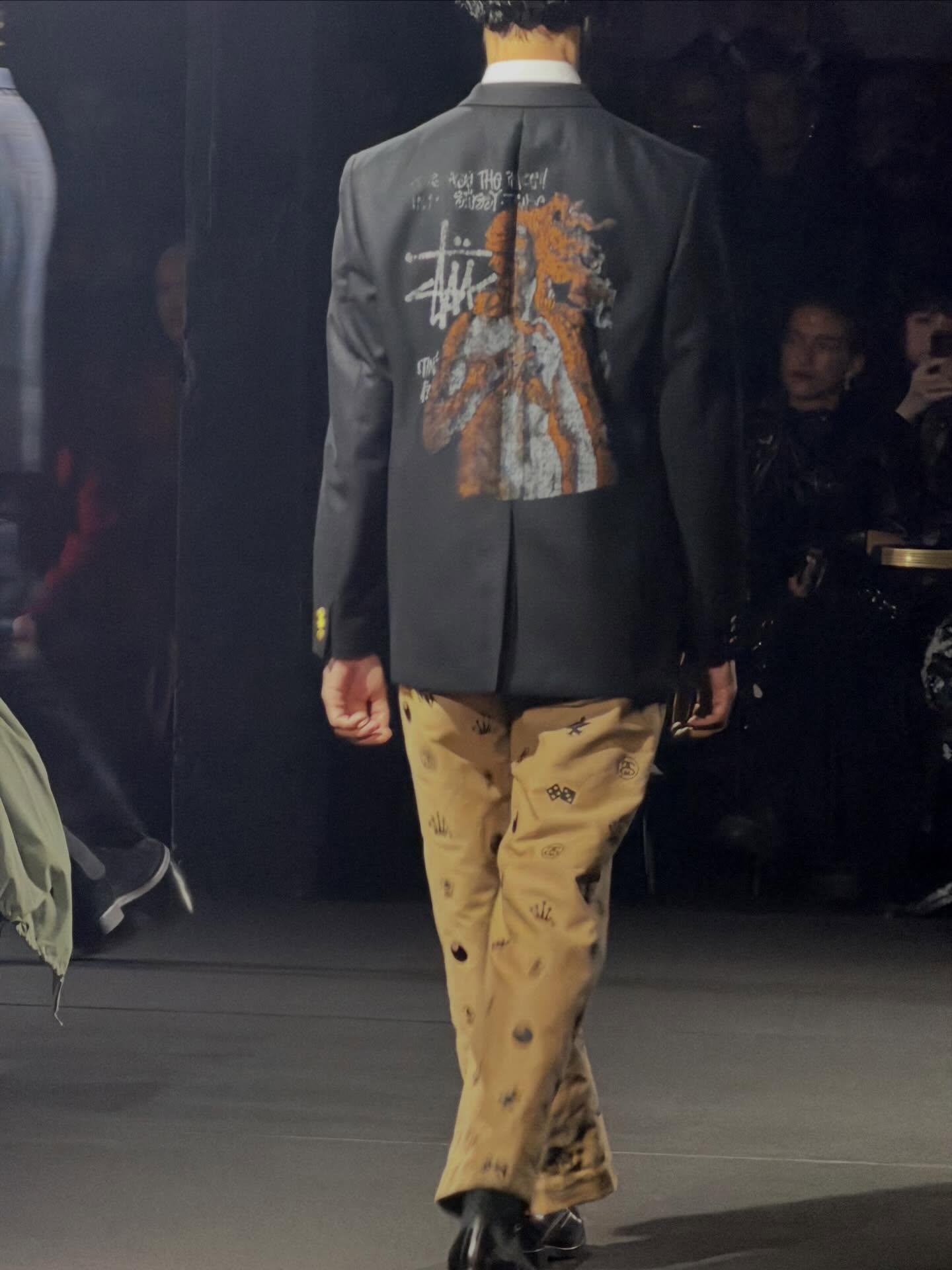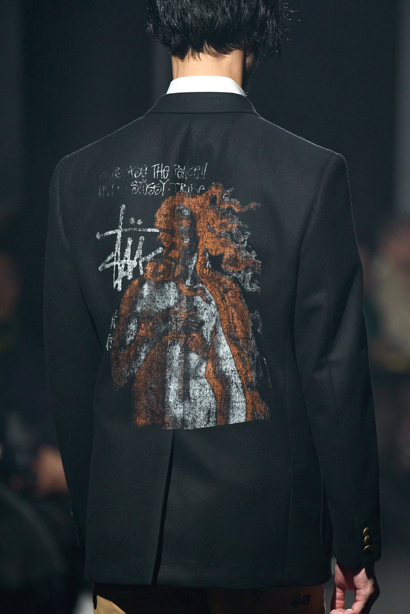 パンツには Stüssy のシンボルパターンが刺繍で刻まれ、ジャケットにはストックロゴと大胆なグラフィックがバックにデザイン。