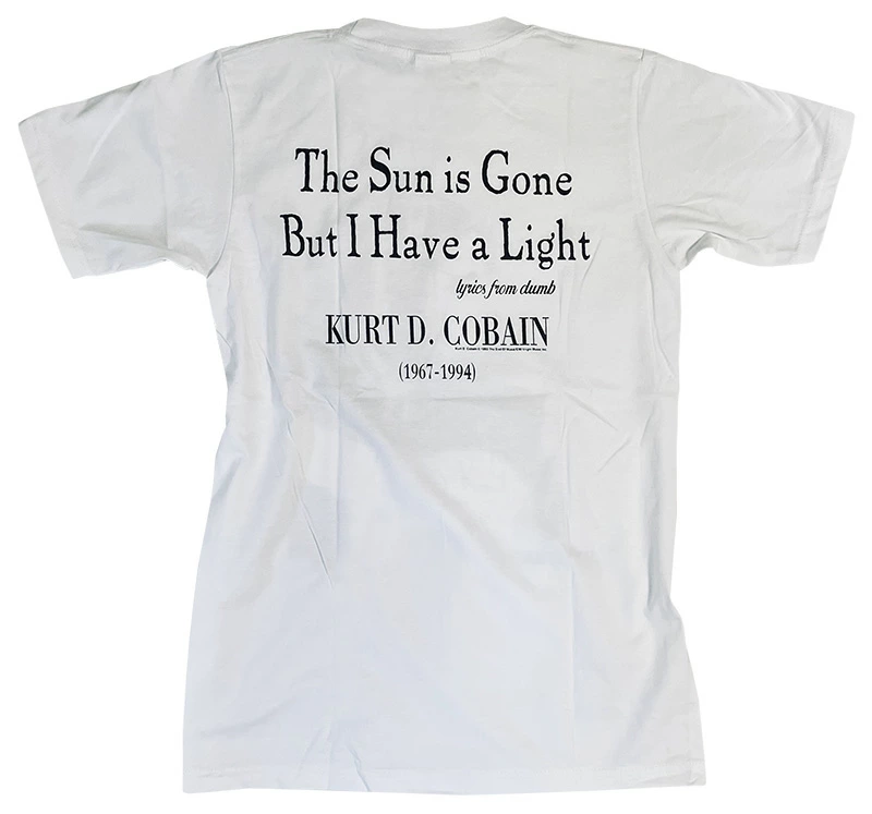 Kurt Cobainのポートレートを前面に、バックにはNirvanaの楽曲Dumbの歌詞「The Sun is Gone But I Have A Light(太陽は去った、でも私には光がある)」らがデザイン。