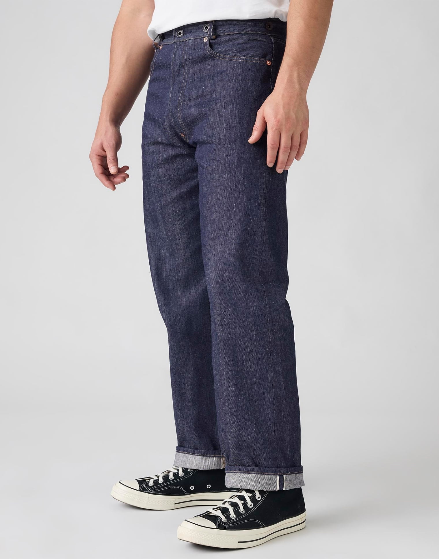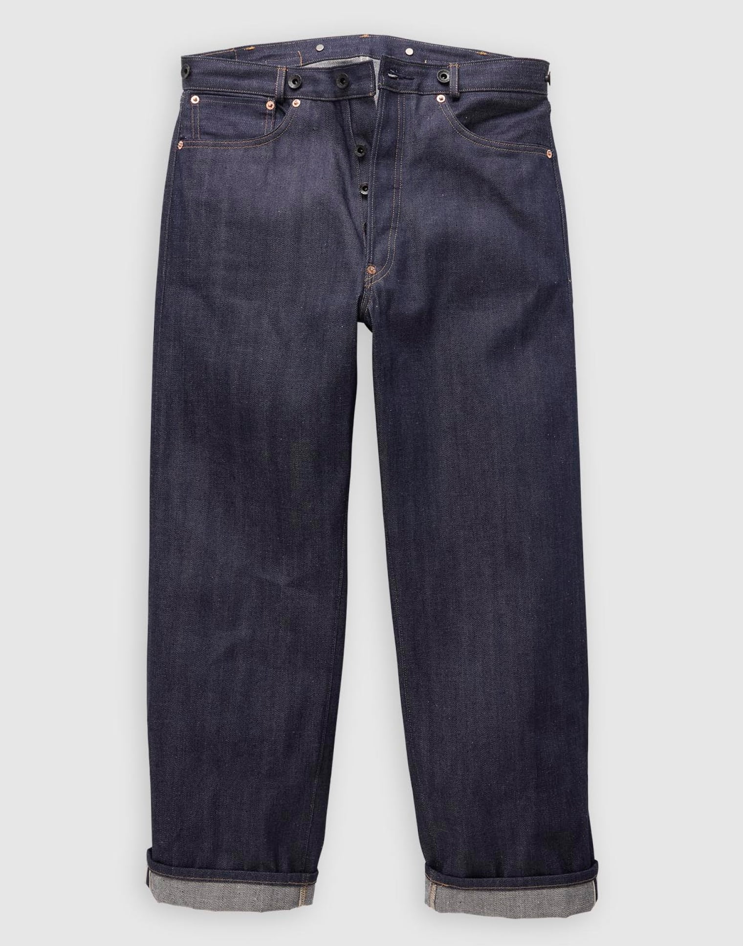LVC 1920s Lot 201 Jeanは、ブラックのブランドドーナツボタン、シンチバック、むき出しの銅製リベットなど、この時代の特徴であるリラックスしたフィットを忠実に再現。
