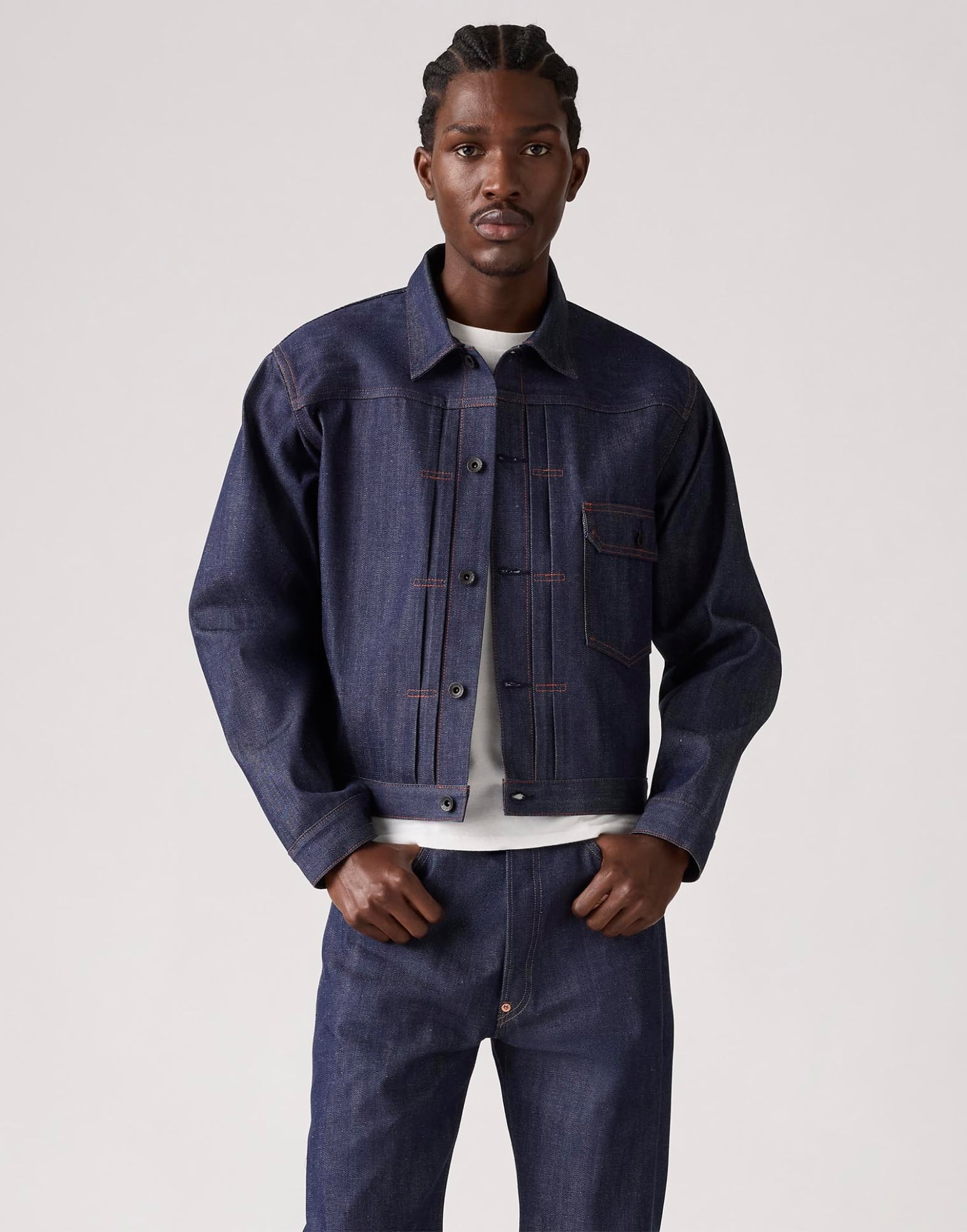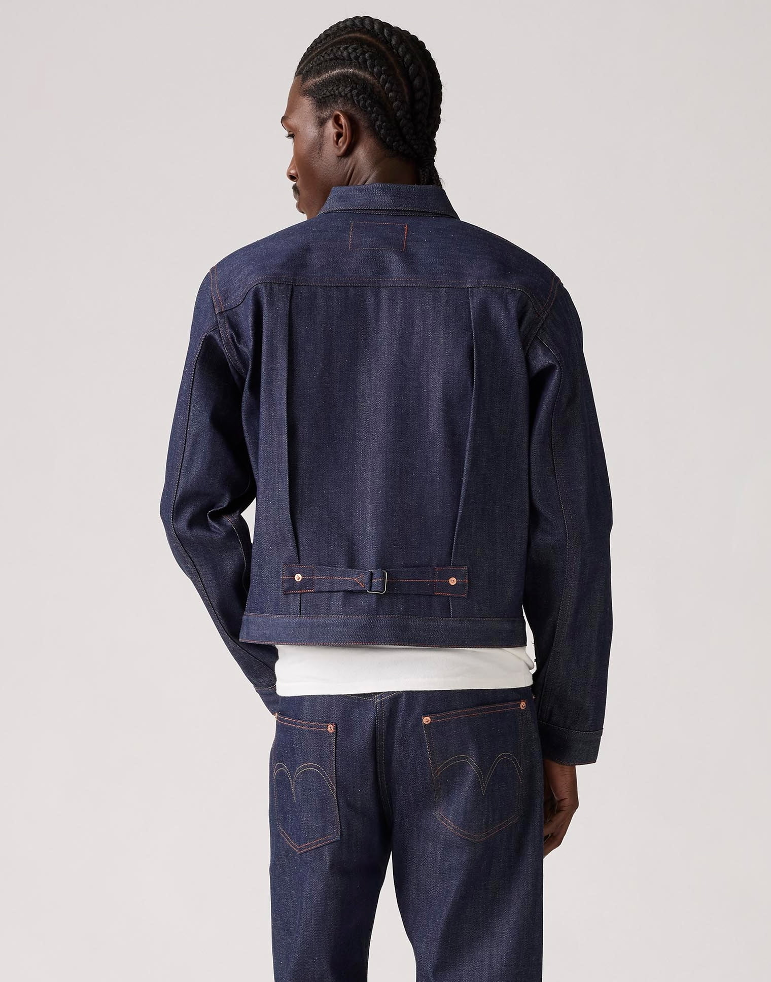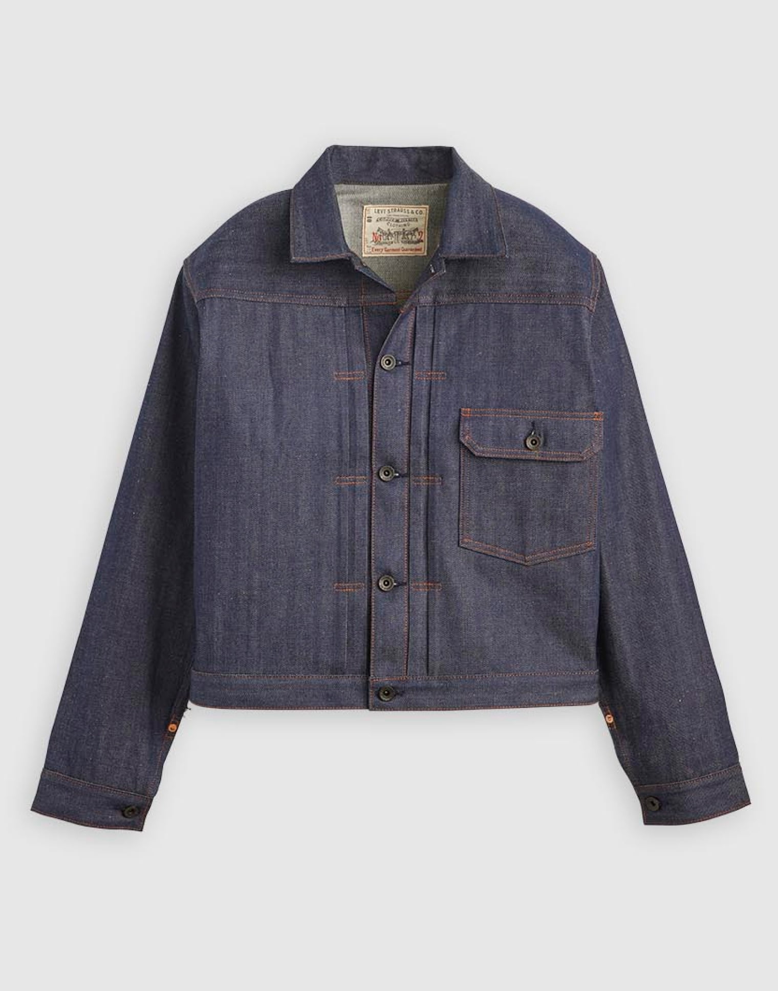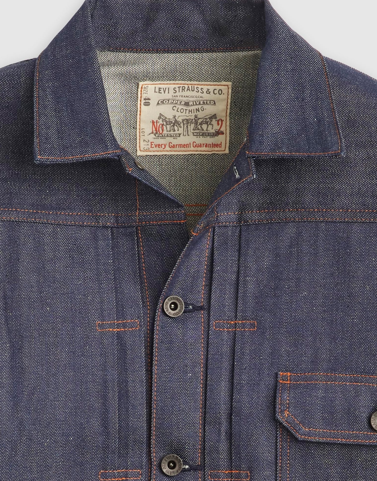 忠実に再現されたこのジャケットは、日本製のシュリンク トゥ フィット™のブルーラインセルビッチデニム、布製のツーホースパッチ、そして上下セットアップで着られるLot 201と同じブラックのブランドドーナツボタンが採用されている。