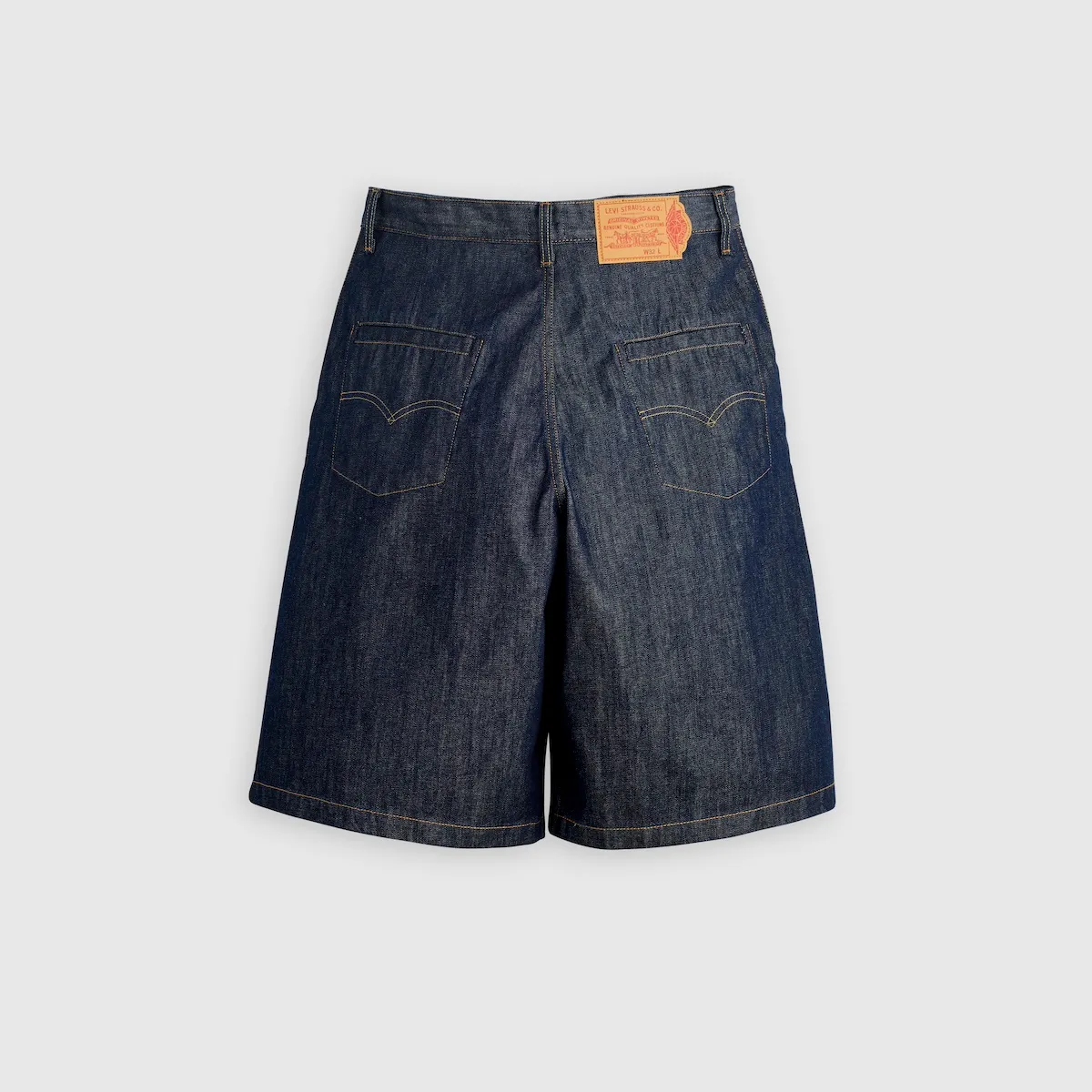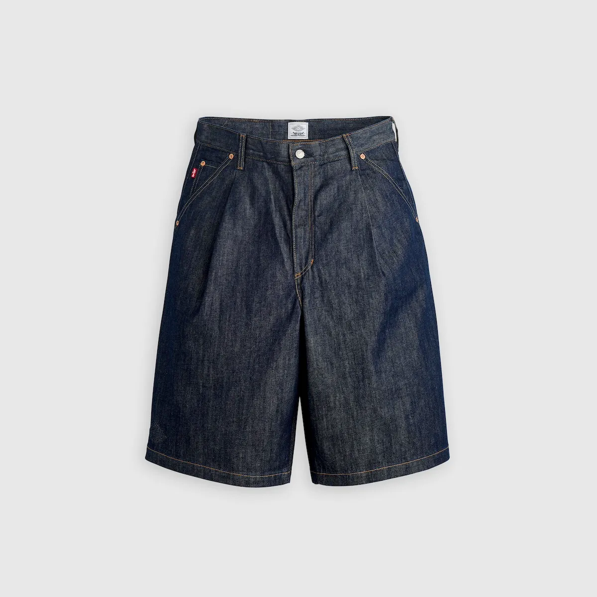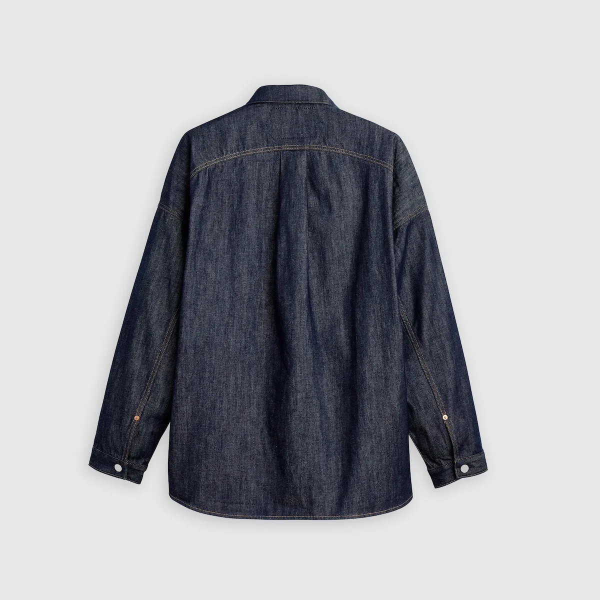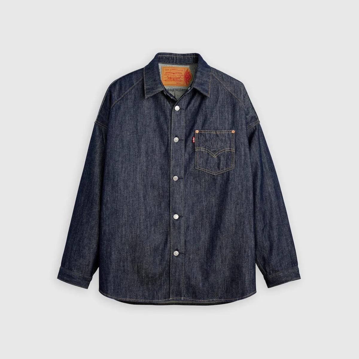 オーバーシャツジャケットは、12オンスのリンス加工インディゴデニムと、Levi’s の特徴的なピッグスキンとゴールドの小麦のディテールが特徴。