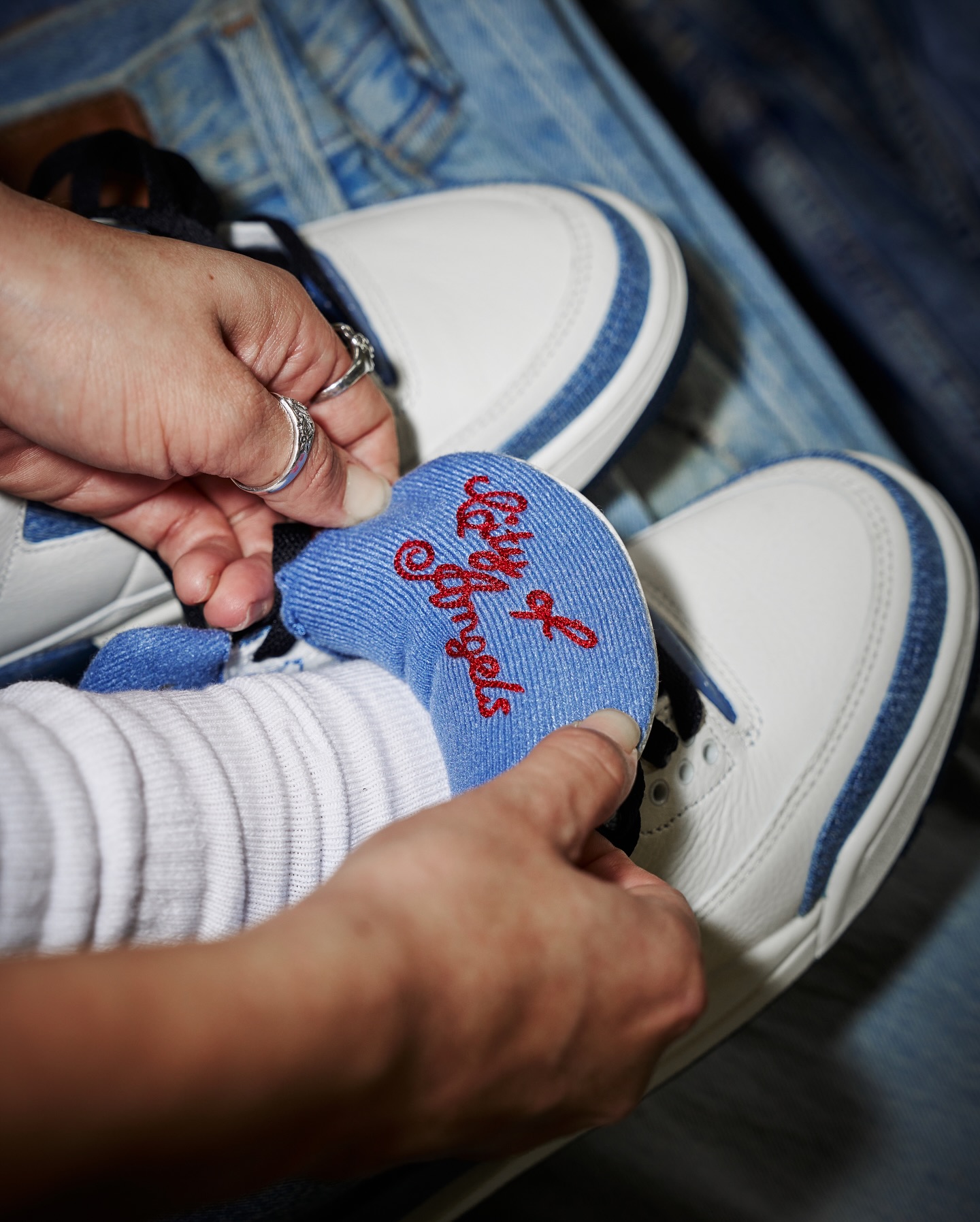 NBA オールスターウィークエンドに販売される LA 限定カラーウェイは、ペブルドレザー、戦略的なブルーデニムのアクセント、赤い「City of Angels」のチェーン ステッチ刺繍を採用した洗練されたアプローチが特徴。