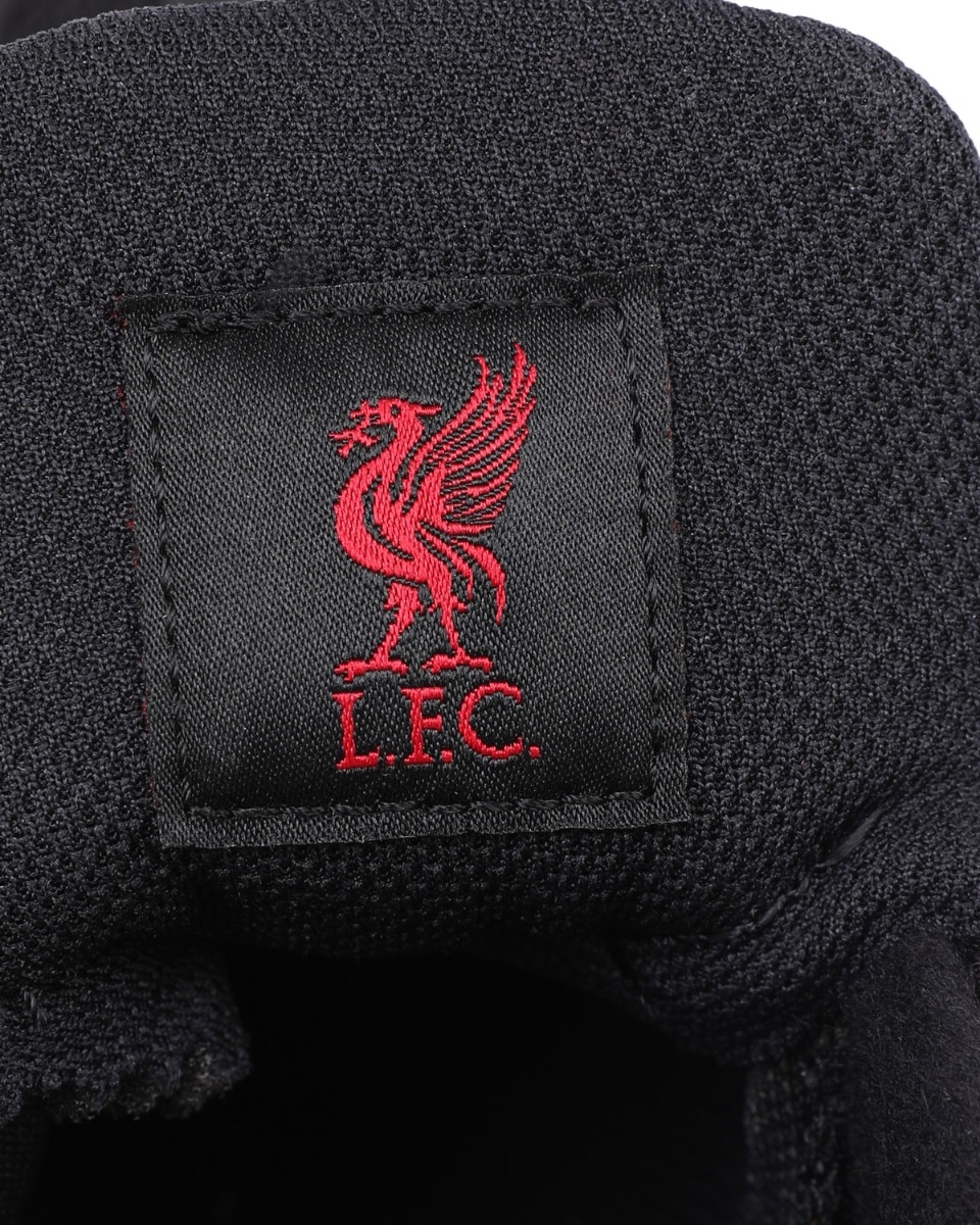 流線型パネルにはスモークグレーとブラックのグラデーションをあしらい、アイレットやシュータンロゴ、サイドのミニスウッシュ、アウトソールなどには、リヴァプール のチームカラーであるジムレッドを採用。