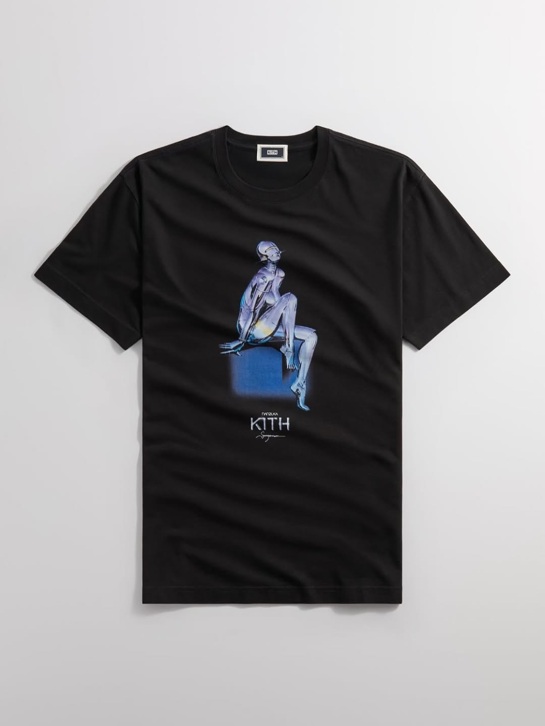 空山氏の代表作「セクシーロボット」を大胆にフィーチャーしたTシャツは、グラフィックと呼応するようにメタリックにアレンジされたKITHロゴとともに、圧倒的な存在感を放つ。