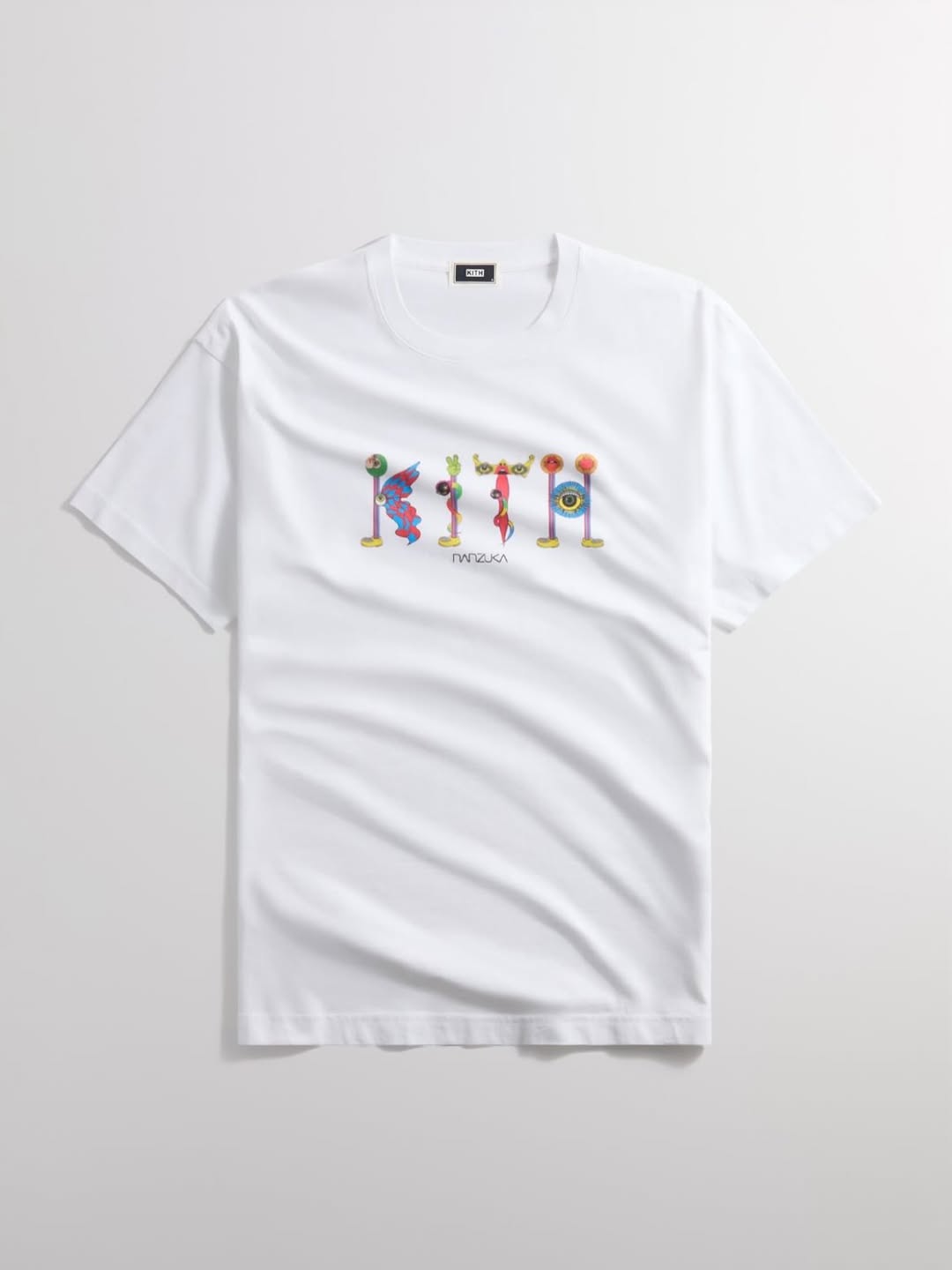 田名網の特徴である、ポップでカラフル、かつ繊細なグラフィックは、KITHのアルファベット一文字ずつに落とし込まれ、ホワイトのTシャツおよびブラックのNelson Crewneckの胸元に配置。