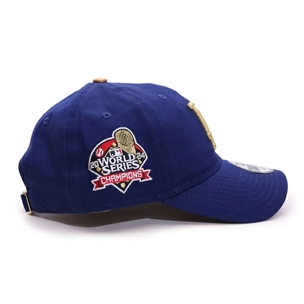前面パネルに刺繍された ドジャース のゴールドロゴ、サイドには2024年のWORLD SERIES CHAMPIONSの記念パッチをレイアウト。