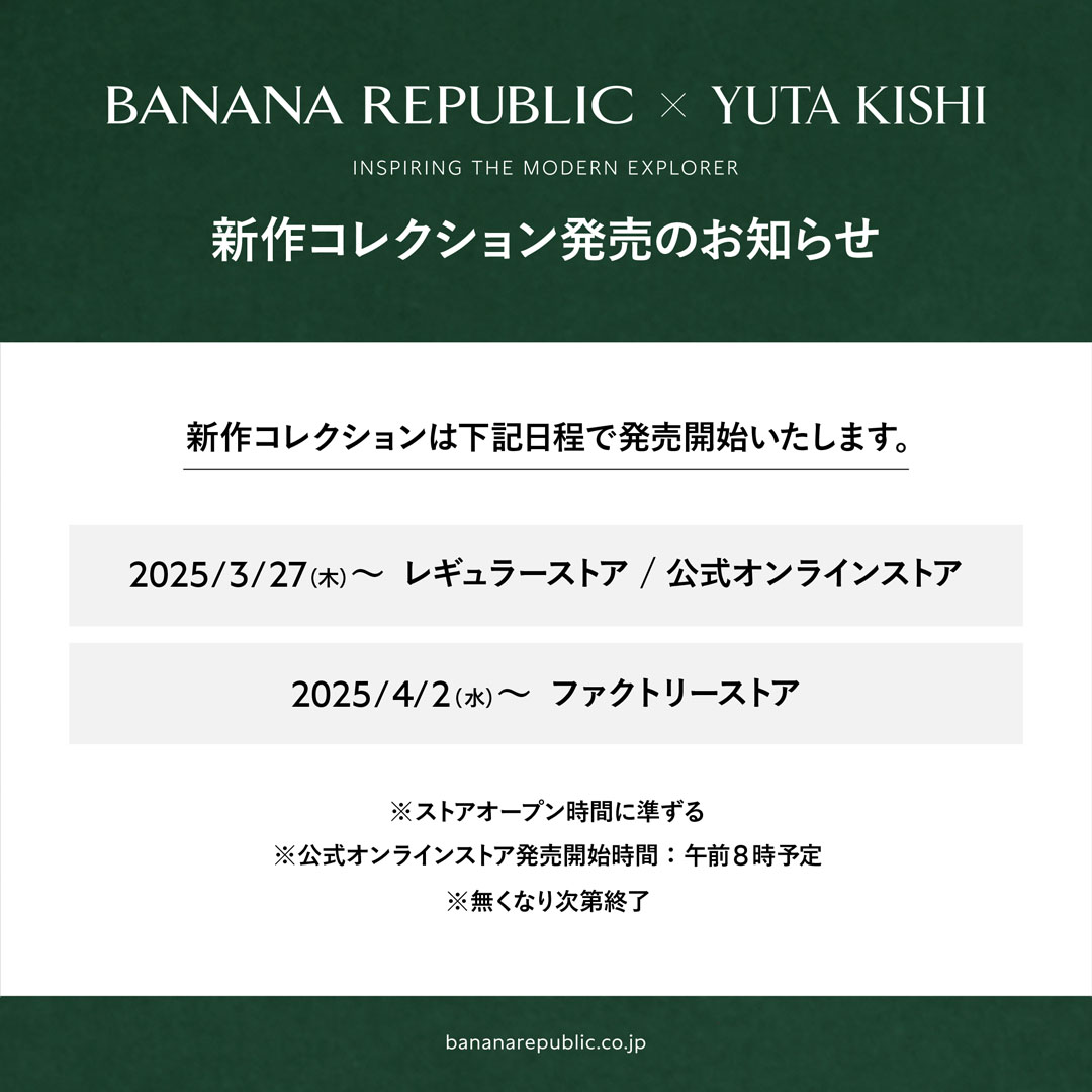 新作コレクションは、2025年3月27日(木)よりバナナリパブリックの公式オンラインストアおよびレギュラーストア、4月2日(水)からはファクトリーストアにて発売される。