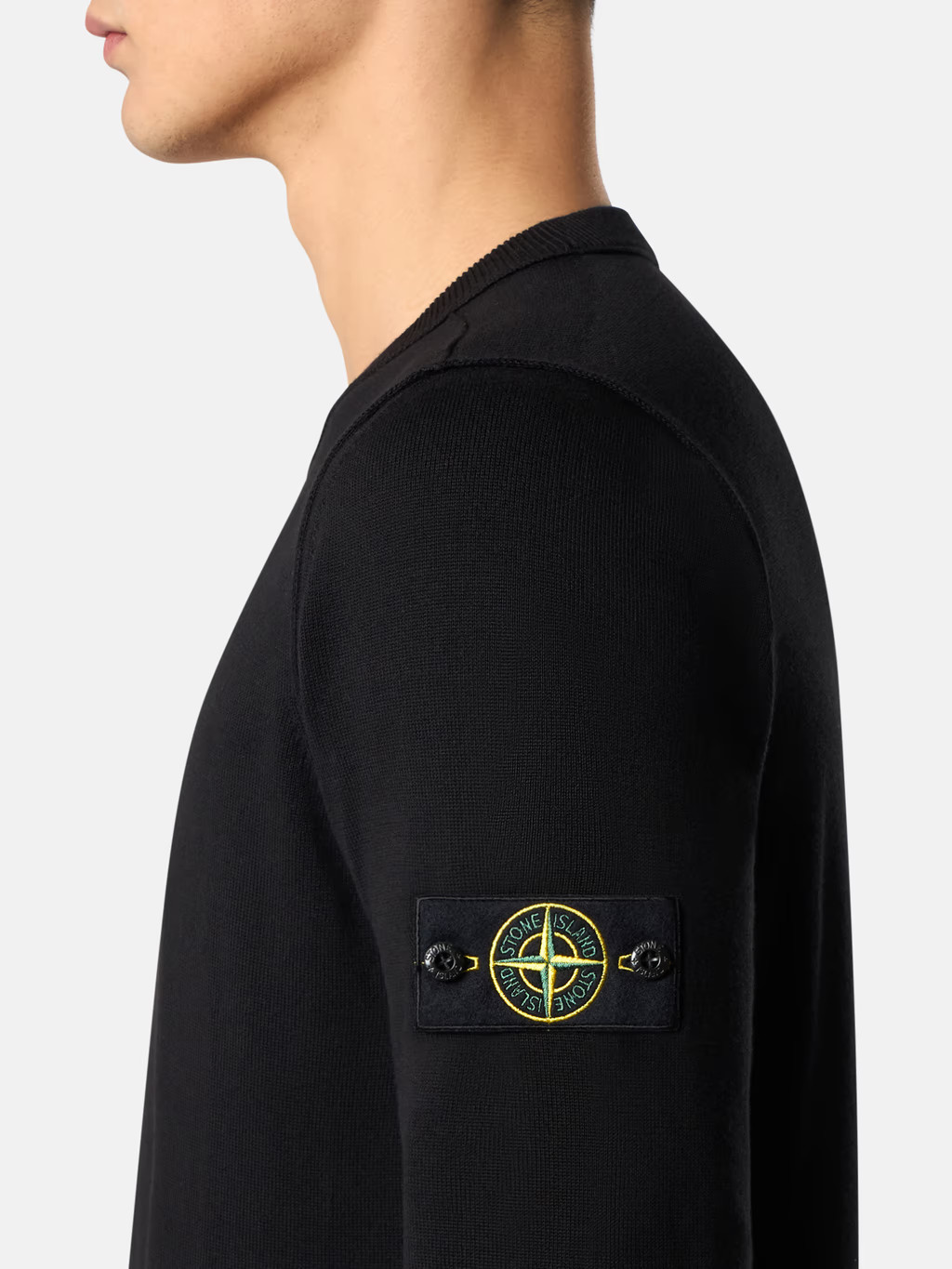 スリーブのコンパスロゴがアクセントになった、アイコニックなクルーネック