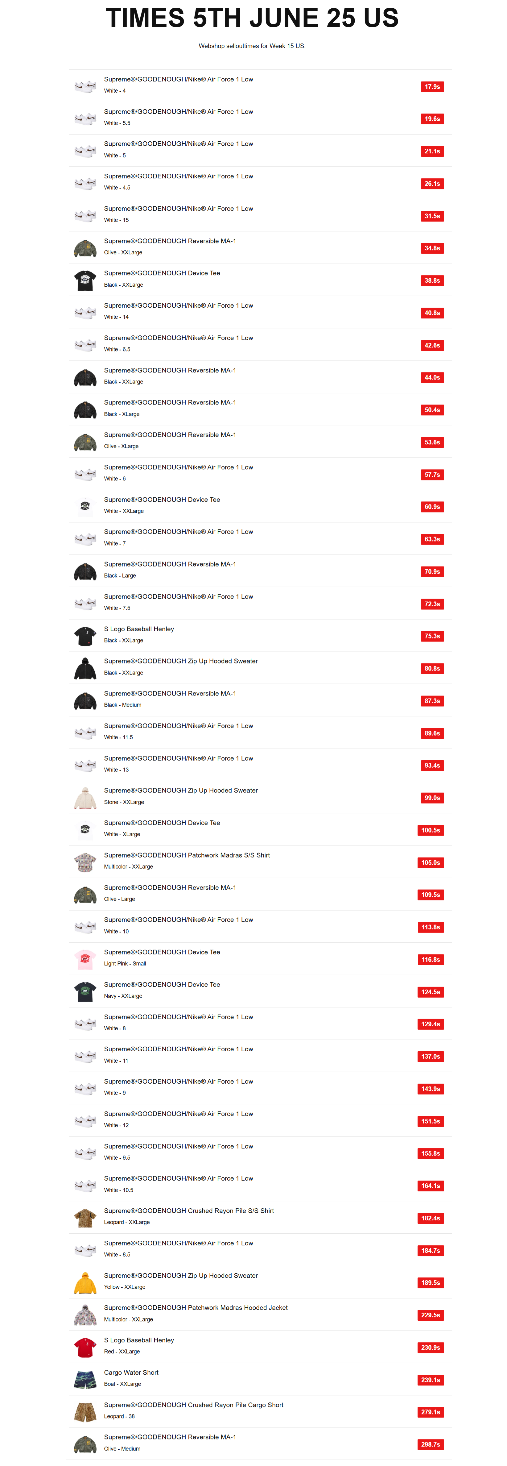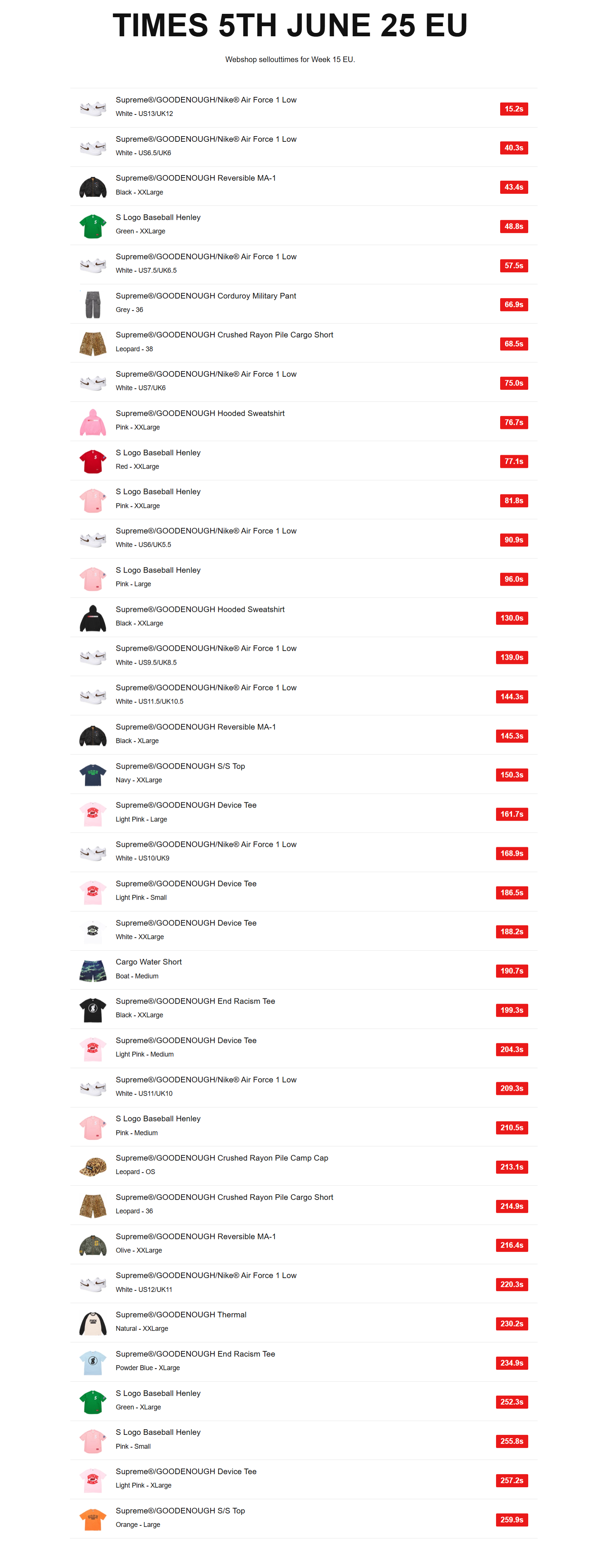 Supreme(シュプリーム) 2025年春夏コレクション WEEK15 にて Goodenough(グッドイナフ) とのコラボコレクションが6月7日(土)に発売される。