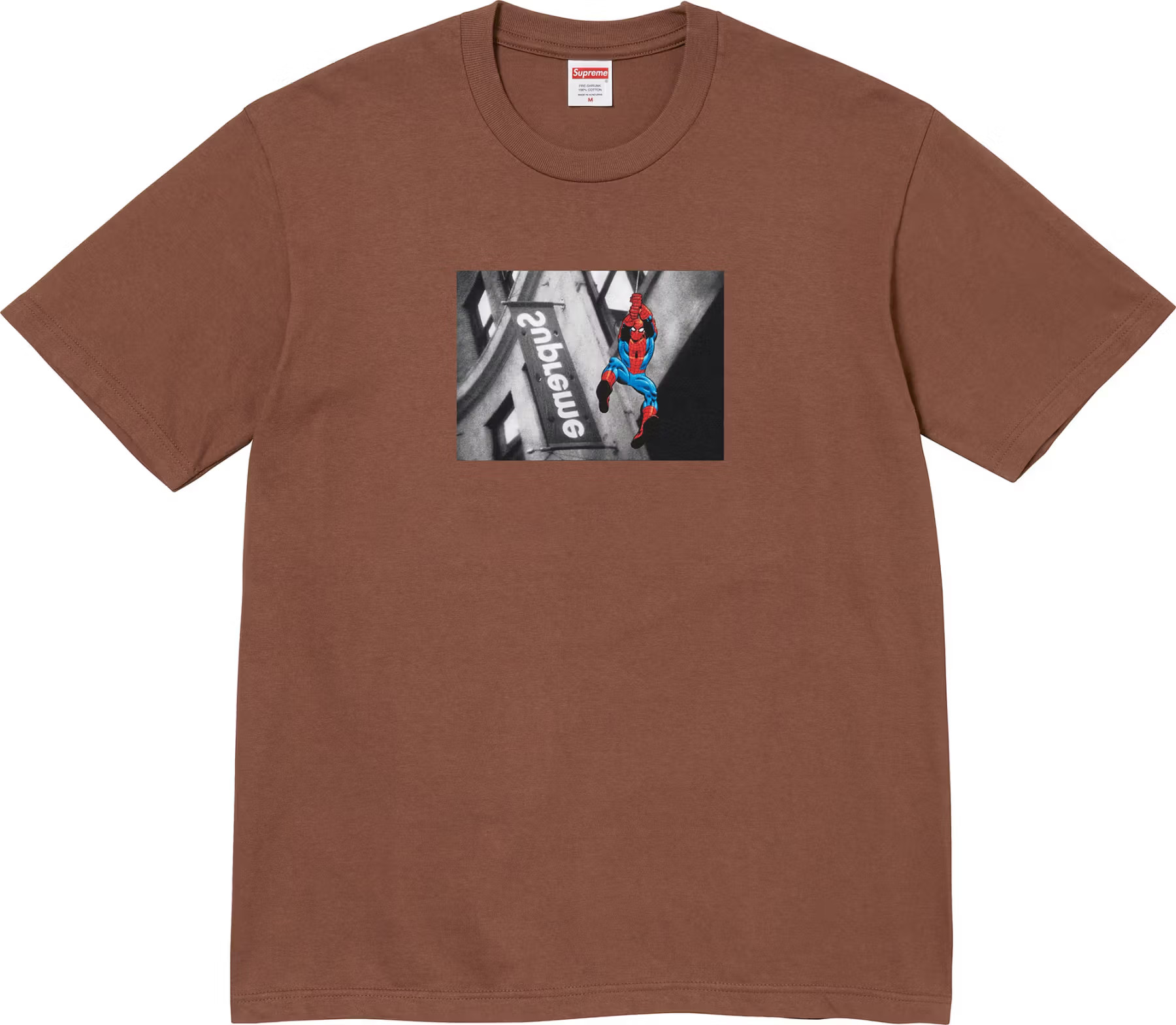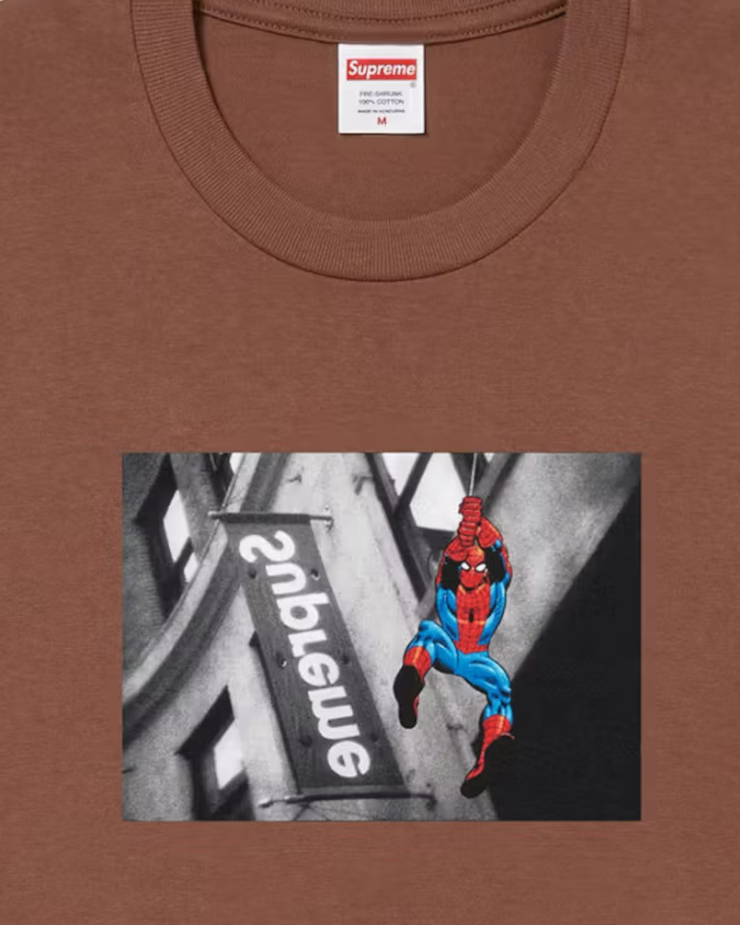 反転した Supreme のロゴ看板を飛び越える スパイダーマン をグラフィックに用いたTシャツ。