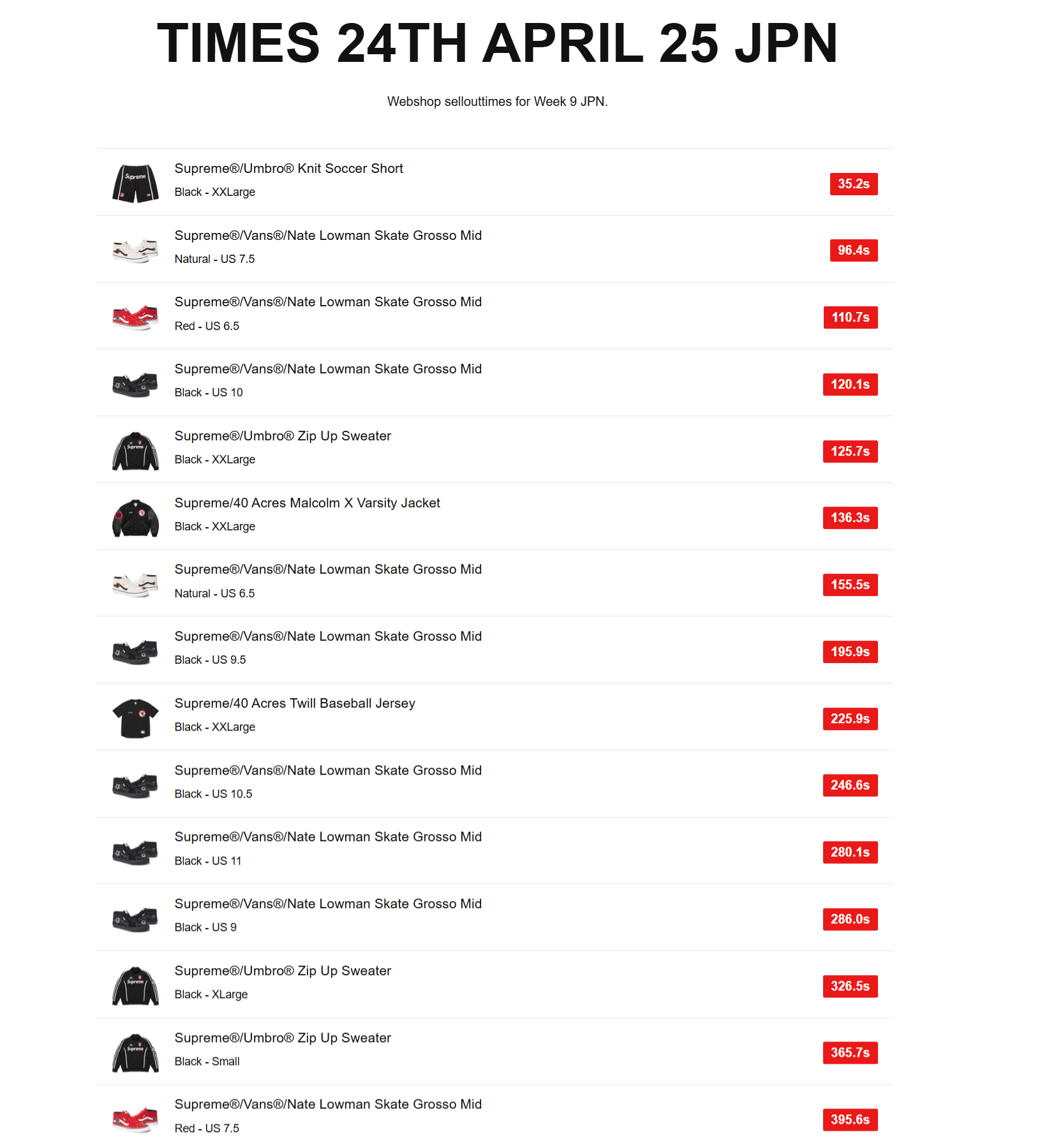 Supreme(シュプリーム) 2025年春夏コレクション WEEK9 の国内における完売スピードランキングをご紹介。