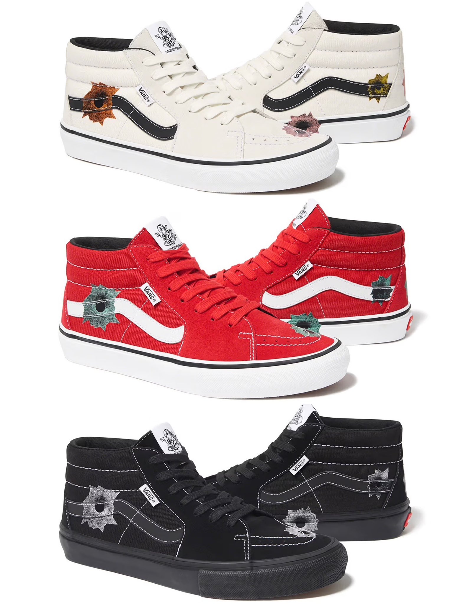 2020年に他界したレジェンドスケーター Jeff Grosso(ジェフ・グロッソ)のシグネチャーモデルである Skate Grosso Mid(スケートグロッソミッド)をベースに、Lowman の有名な銃弾痕のアートワークを配置。
