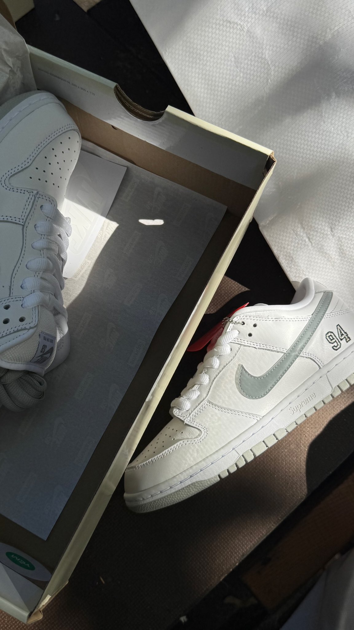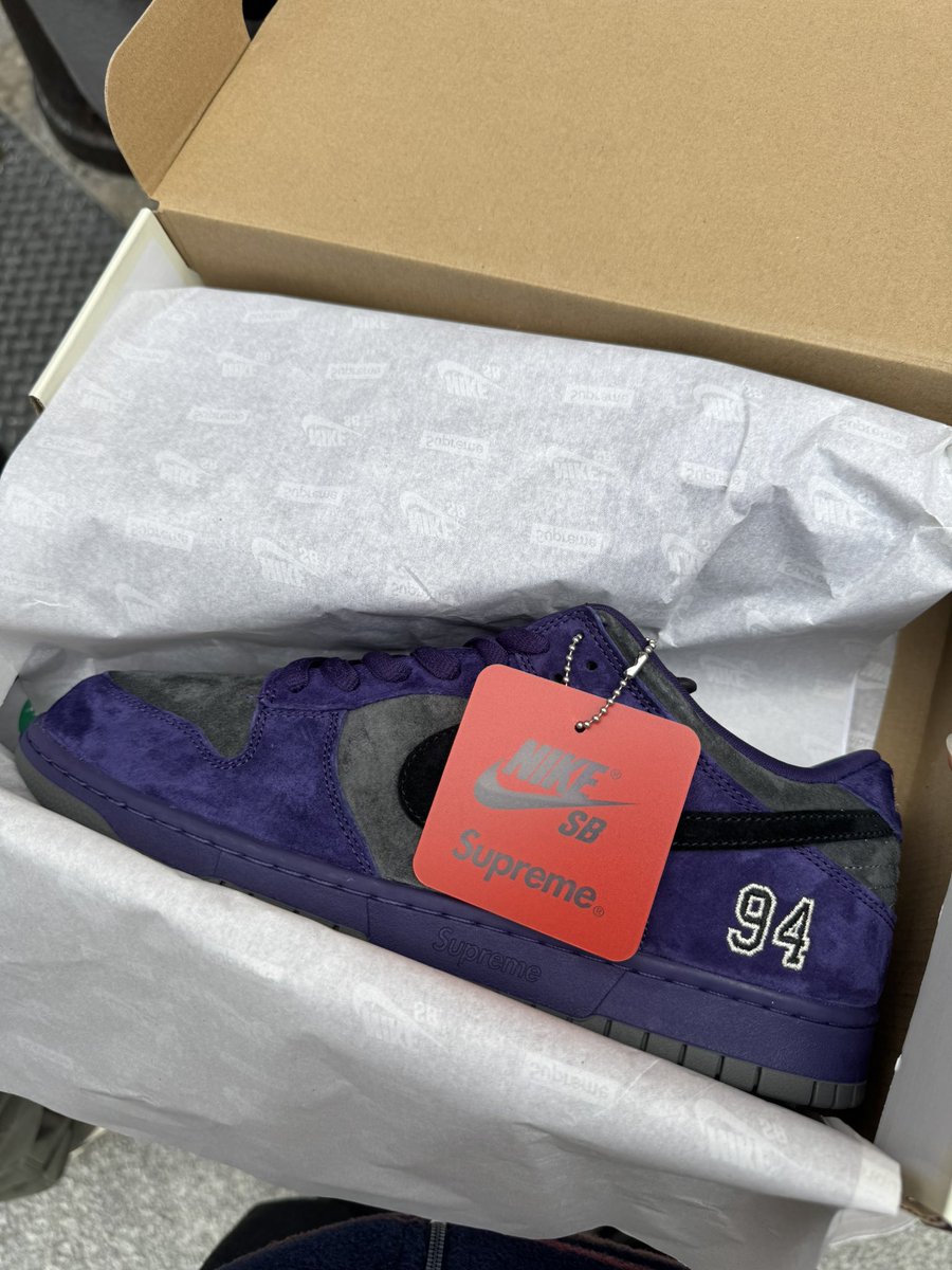 ブラック、ホワイト、ブルー、グリーン、パープルの5色で構成されるDUNK LOWは、クラシックなラバーアウトソール、高反発のZoom Airユニット、Supremeの設立年である“94”を刻印したヒールなどが特徴だ。