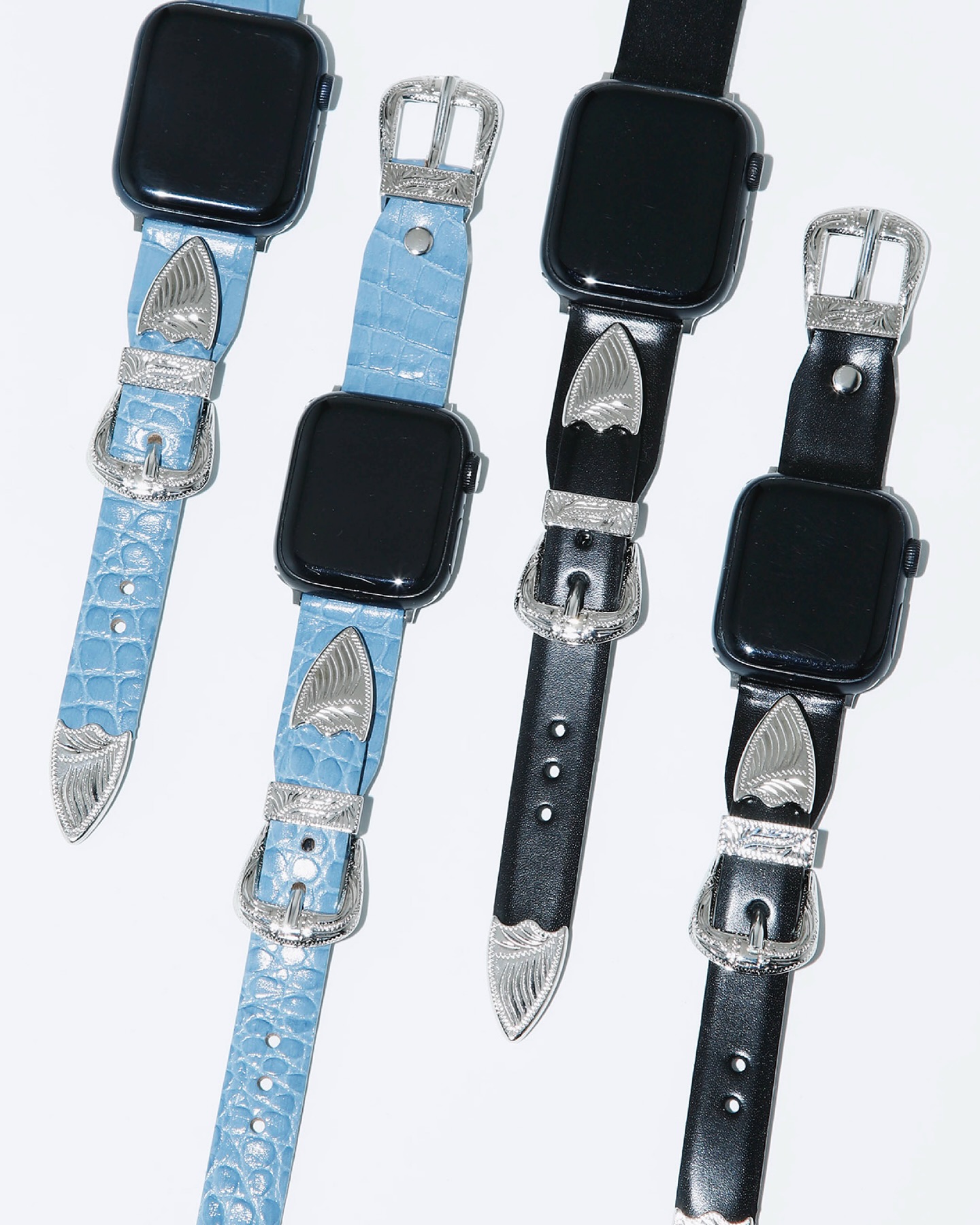 ダブルバックル仕様のベルトは、ライトブルーレザーのクロコ柄のエンボスと光沢のあるブラックレザーの2色展開。