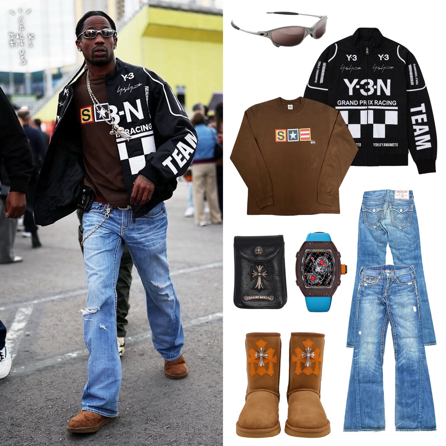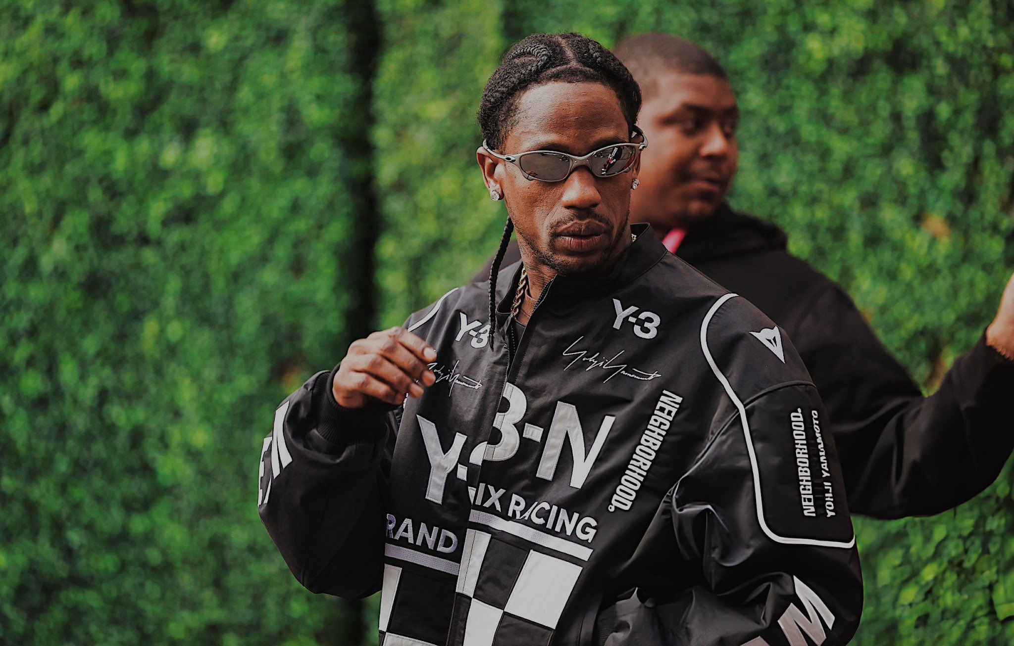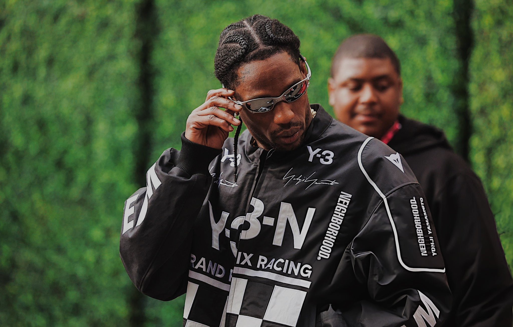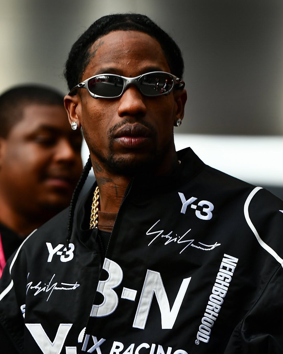 トラヴィス はレーシングに合わせ Y-3(ワイスリー) と NEIGHBORHOOD(ネイバーフッド) のコラボジャケットを着用し登場。