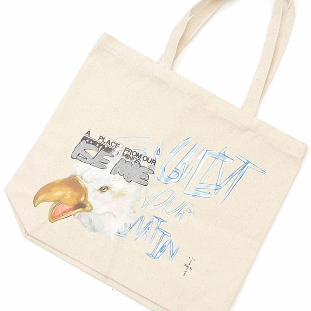 両面に炎のグラフィックとリアルなイーグルを配した生成りのトートバッグ。