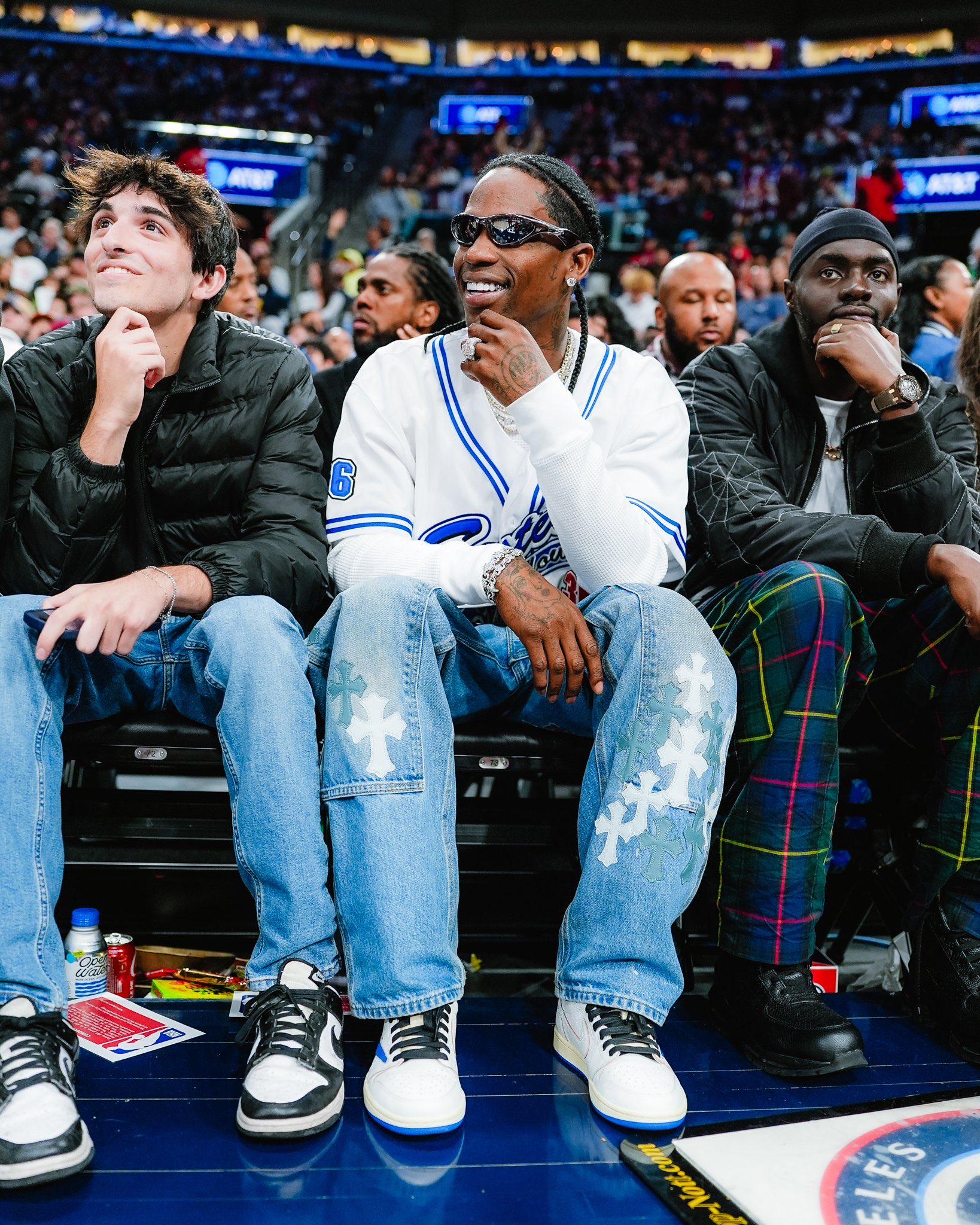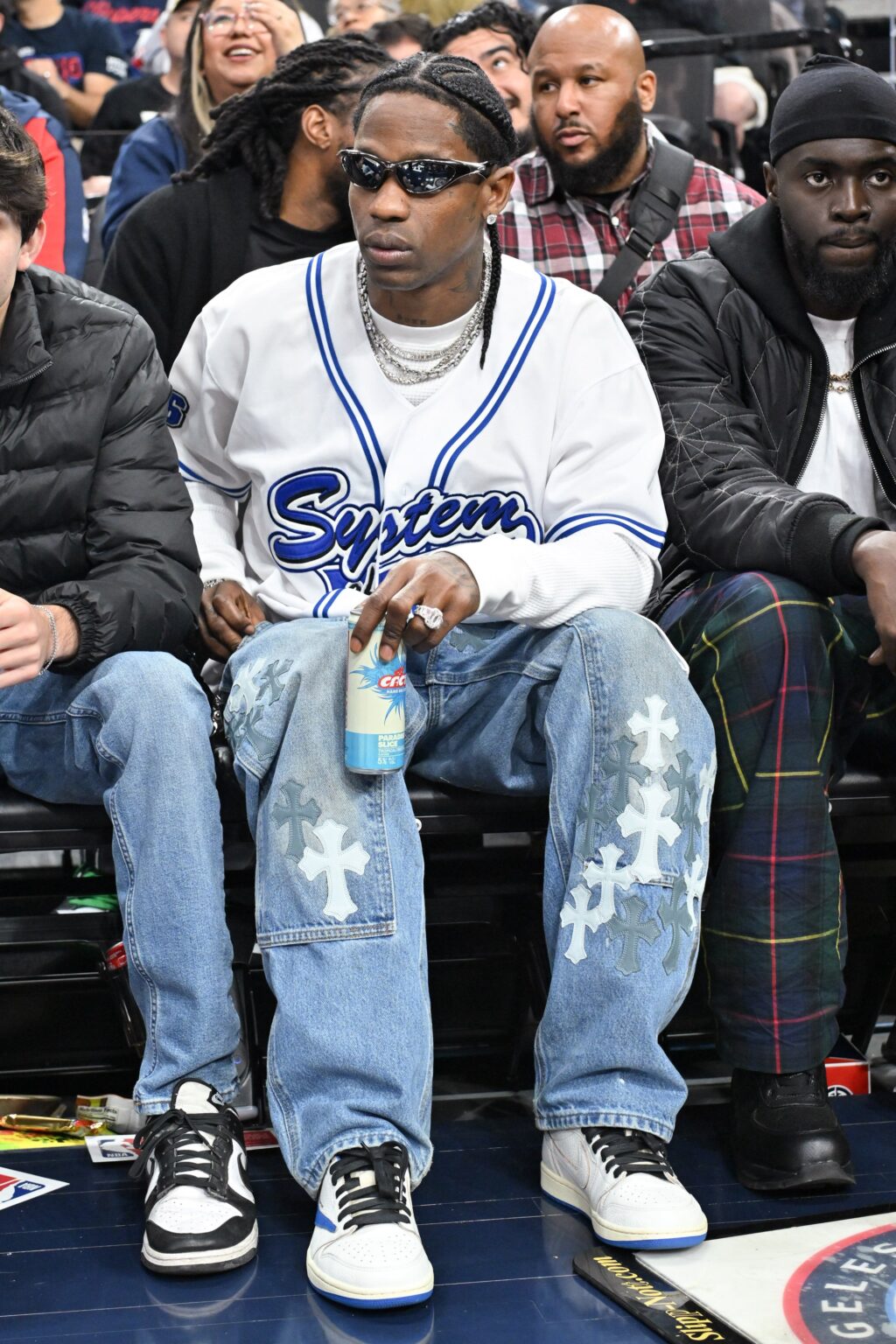 この日の 山本 は、スニーカーは Travis Scott × fragment design × NIKE AIR JORDAN 1 LOW “Sail/Military Blue”、パンツとトップスはクロムハーツ、ネックレスはゴローズを着用した。