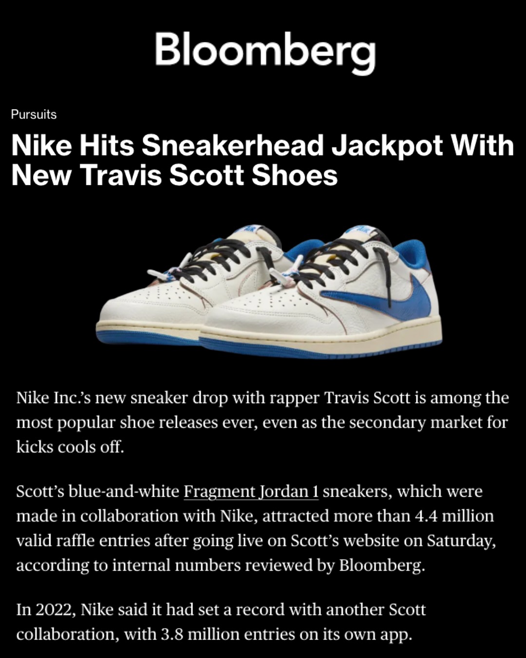 ・2025/11/19 UPDATE:Travis Scott × fragment design × NIKE AIR JORDAN 1 LOW “Sail/Military Blue” が、スニーカー抽選史上最多応募数を記録した。