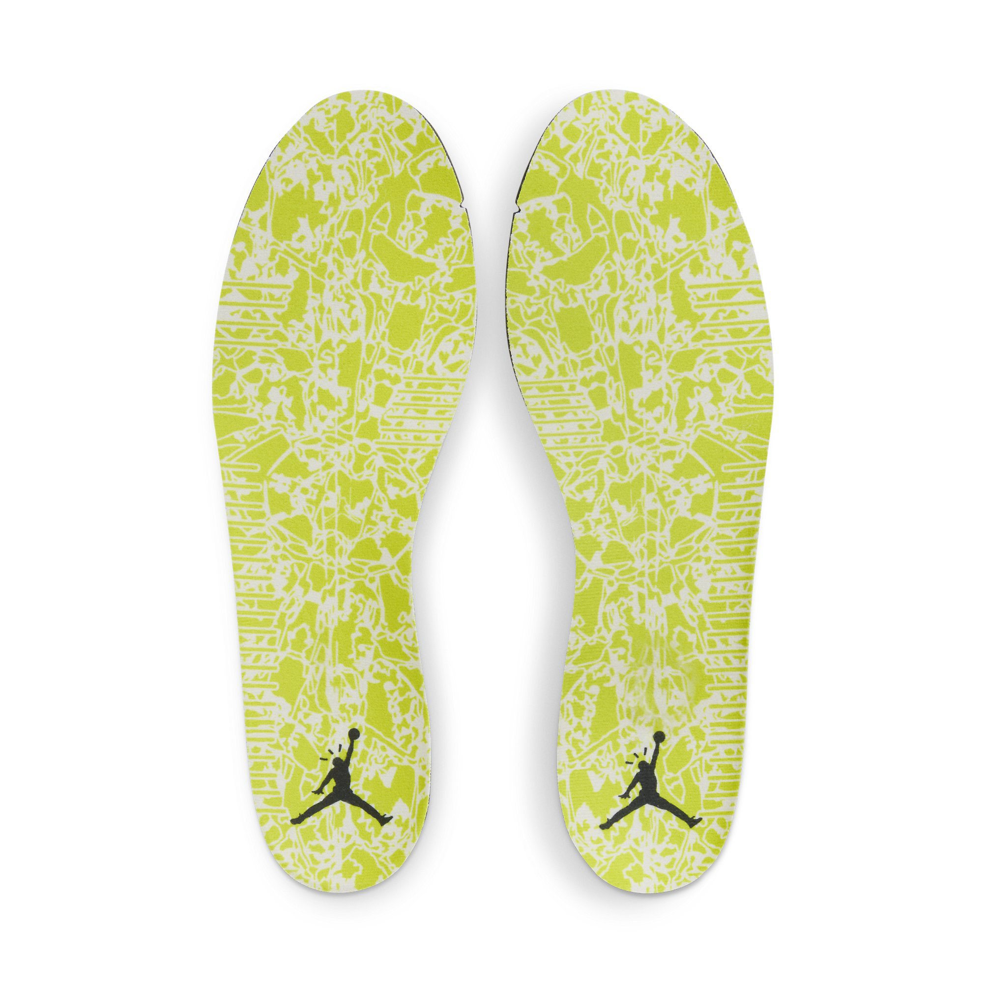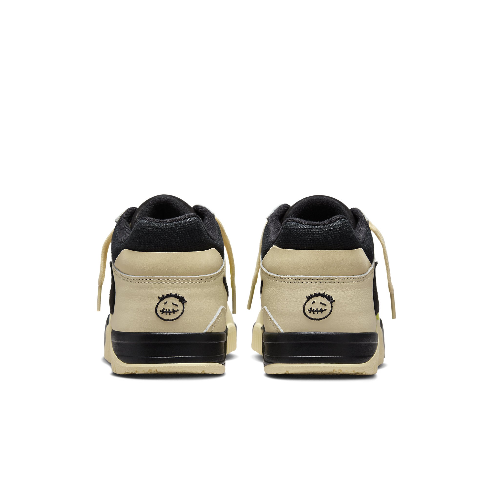 オーバーレイのレザーやソール、リバーススウッシュなどにはブラックとホワイトを採用し、アンダーレイのキャンバス素材にはボルトカラーが取り入れられている。