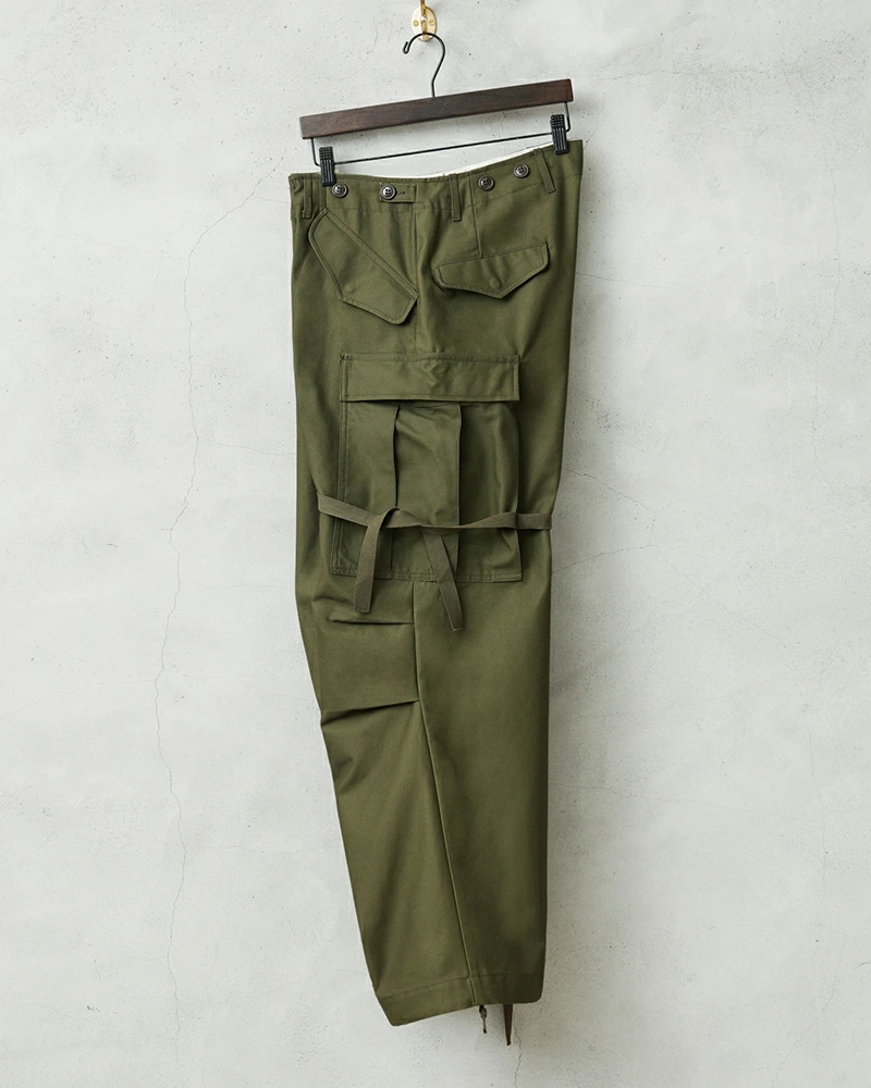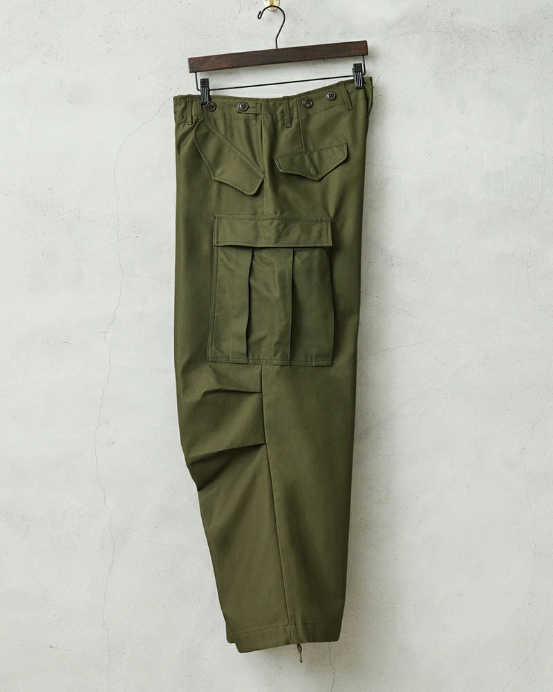 ウエスト部分には特徴的なタブ式のアジャスターを採用し、金属バックルを用いないシンプルな構造は、後年のジャングルファティーグパンツにも通じるミニマルな実用性を実現している。
