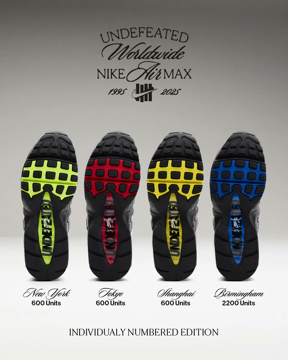 先日、ブラック&セイルエディションをリリースしたばかりの UNDEFEATED が、今年を締めくくるにあたり、4足のスペシャルな地域限定 AIR MAX 95 を用意。