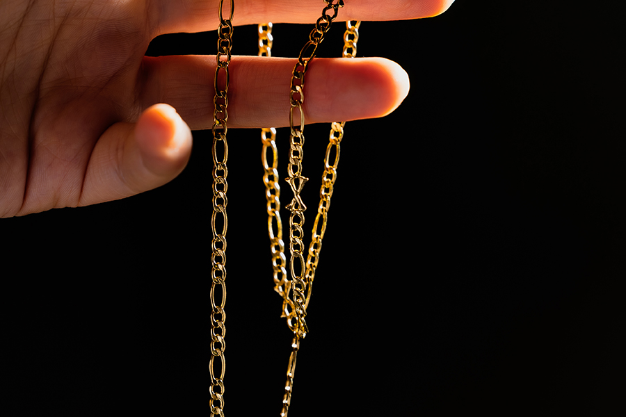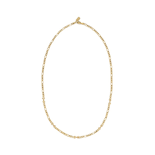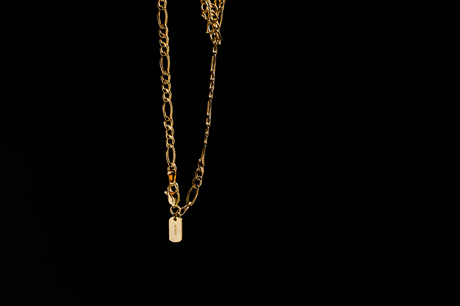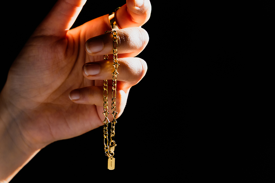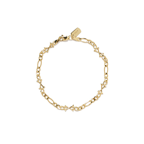 チェーンのベースはFIGAROで、異なる2種のコマを交互に連結させた軽やかな表情の中に、WTAPS のアイコニックなモチーフであるクロスボーンのコマを配置し、ユニークな印象に仕上げている。