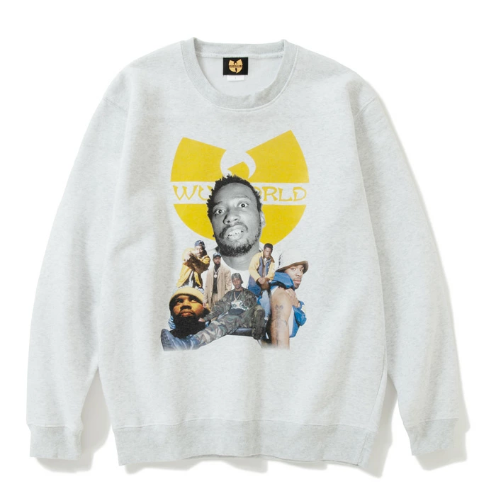 フロントにWUロゴと、コラージュされたメンバーのフォトがプリントされたクルーネックのスウェット。